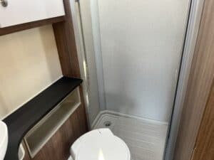 There’s an unusual feature in the shower room. The shower cubicle has two drain-holes, so if your caravan isn’t quite level, the water will still drain away, an ingenious solution.
