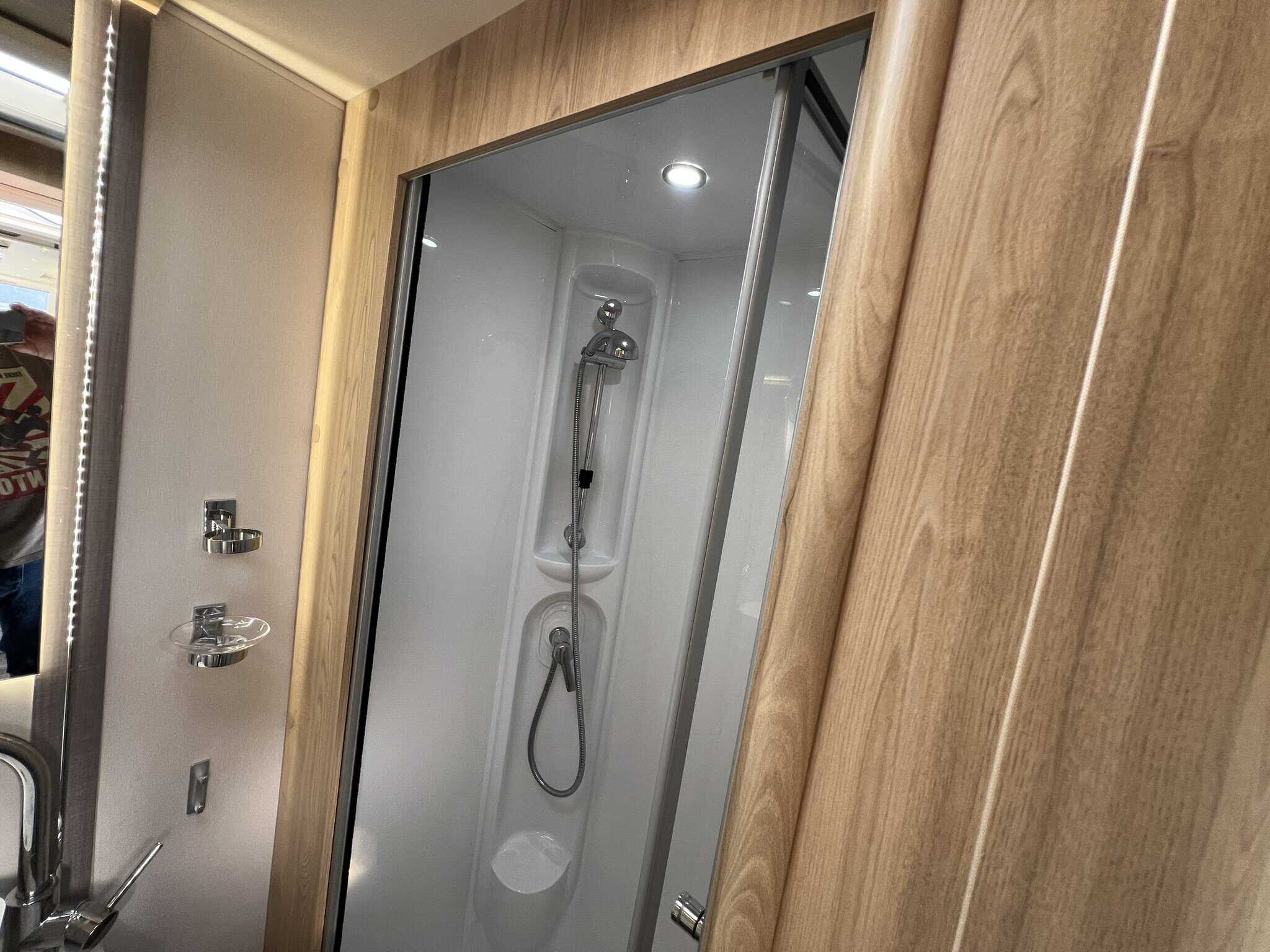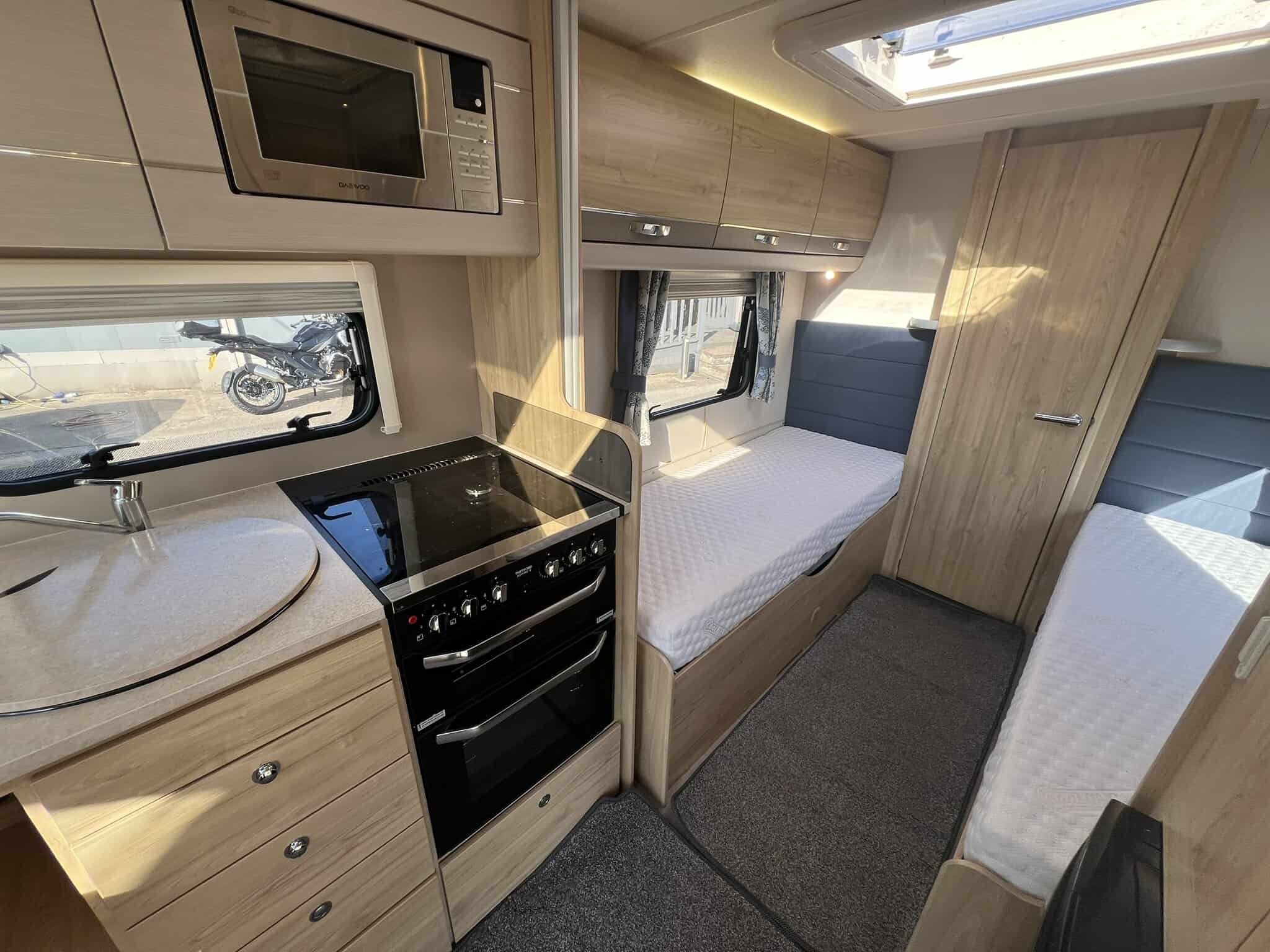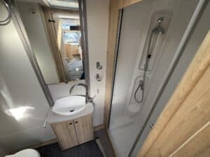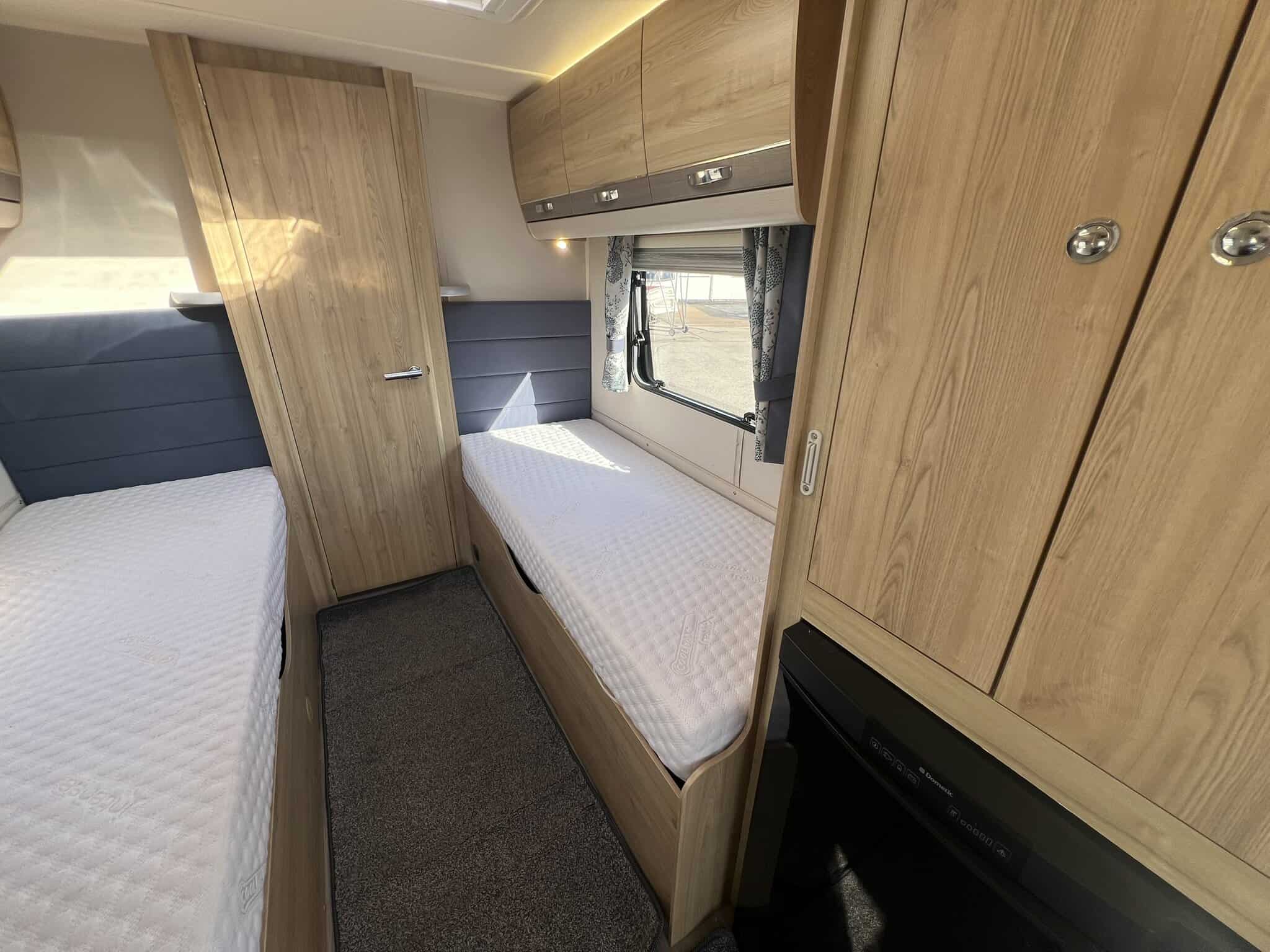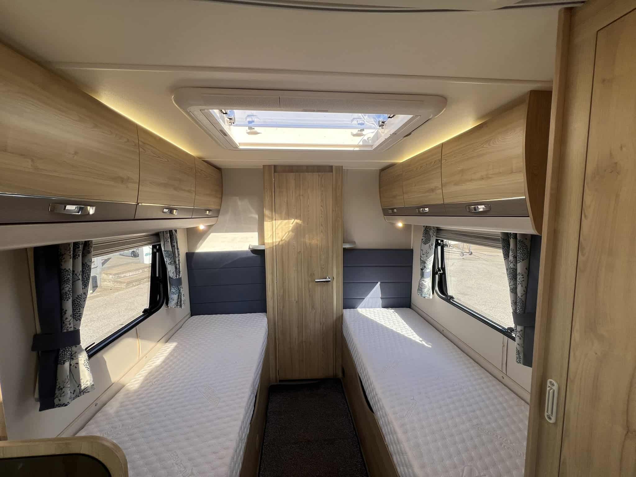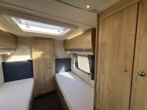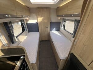 A strength of this type of twin-bed layout is that it allows you to have a full-width shower room, which you can get to easily via a clear aisle down the centre of the caravan between the beds.