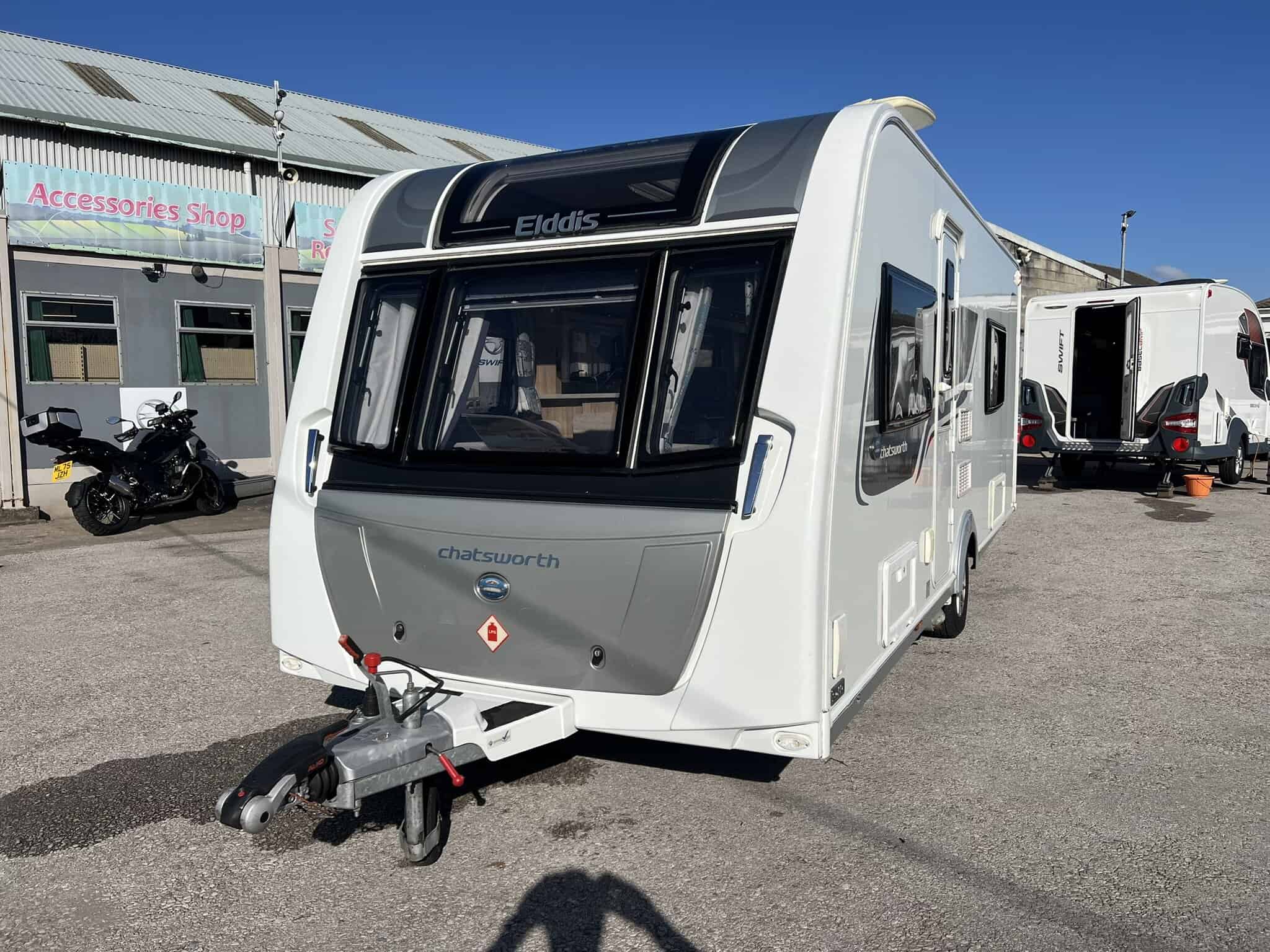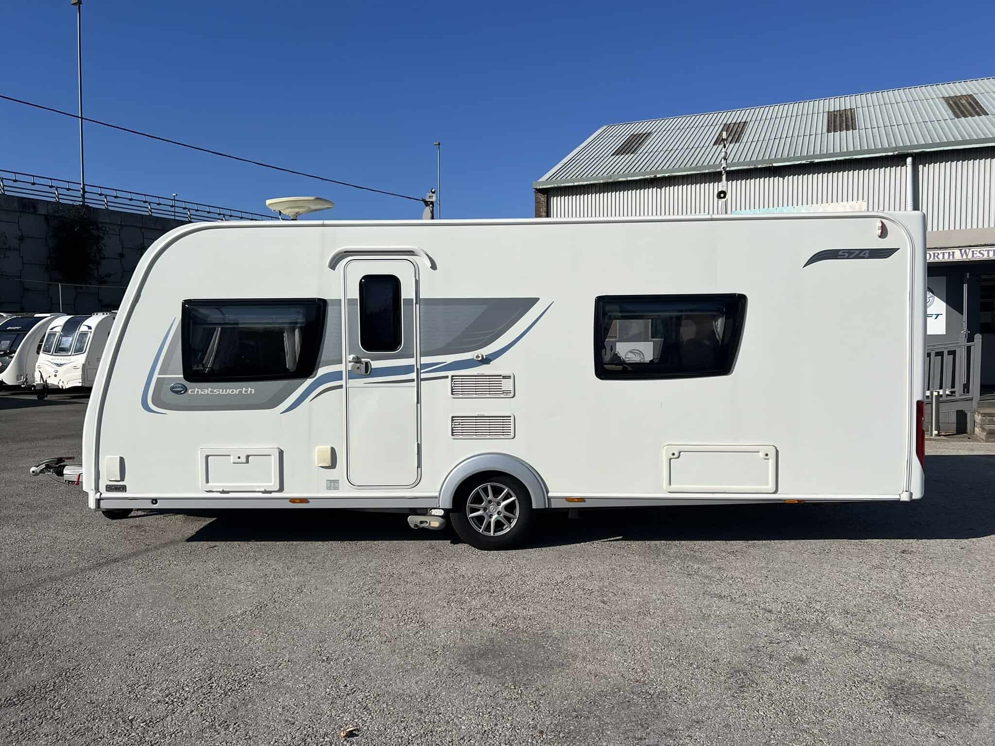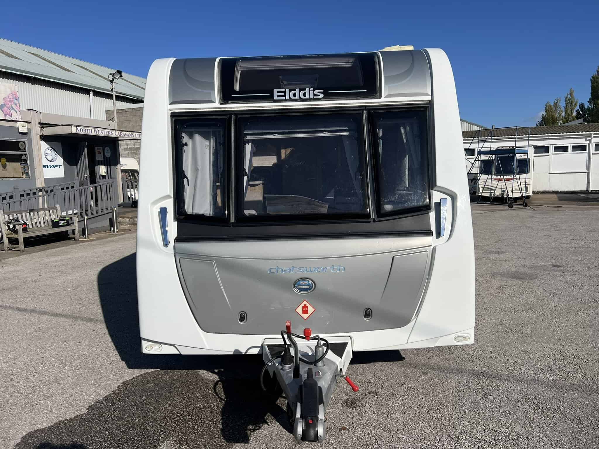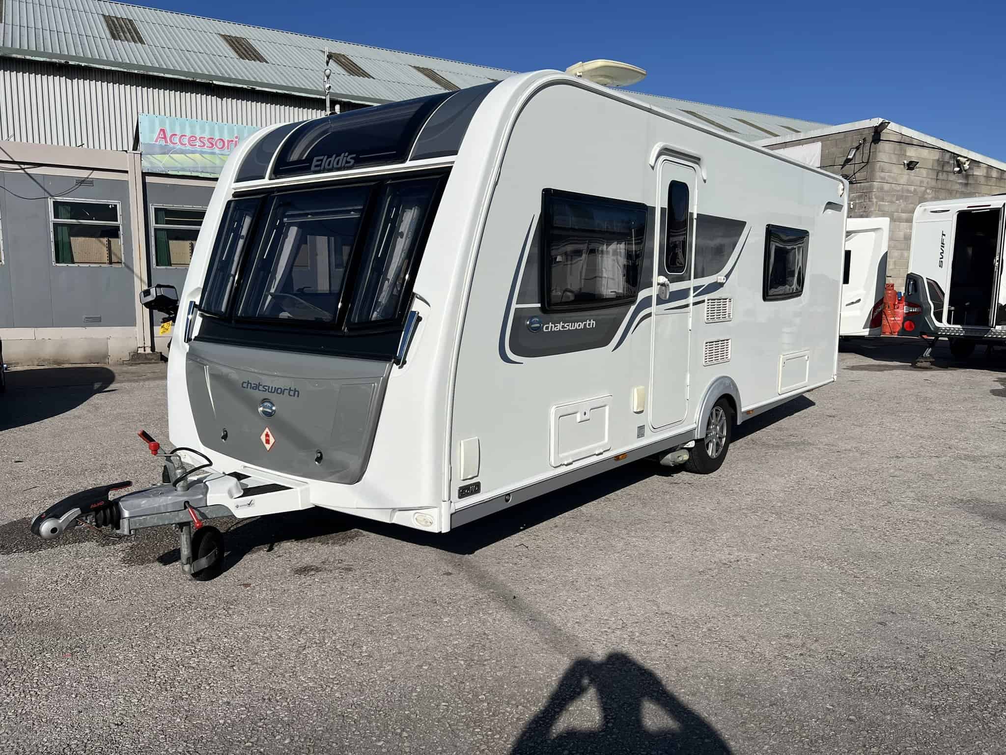 The 2017 Elddis Chatsworth 574 is a four-berth, single-axle touring caravan with a layout featuring twin fixed rear beds, designed primarily for couples but suitable for families. Key features include a contemporary exterior with an ABS front panel and alloy wheels, a practical kitchen with a worktop extension, a central washroom with a vanity unit and heated towel rail, and a lounge with a panoramic sunroof for ample light. For heating and hot water, it uses the Truma Ultraheat dual-fuel system, and it is built on a BPW chassis with Grade III thermal insulation. It offers practical features like exterior storage with a 230-volt socket and an external gas supply for barbecues.