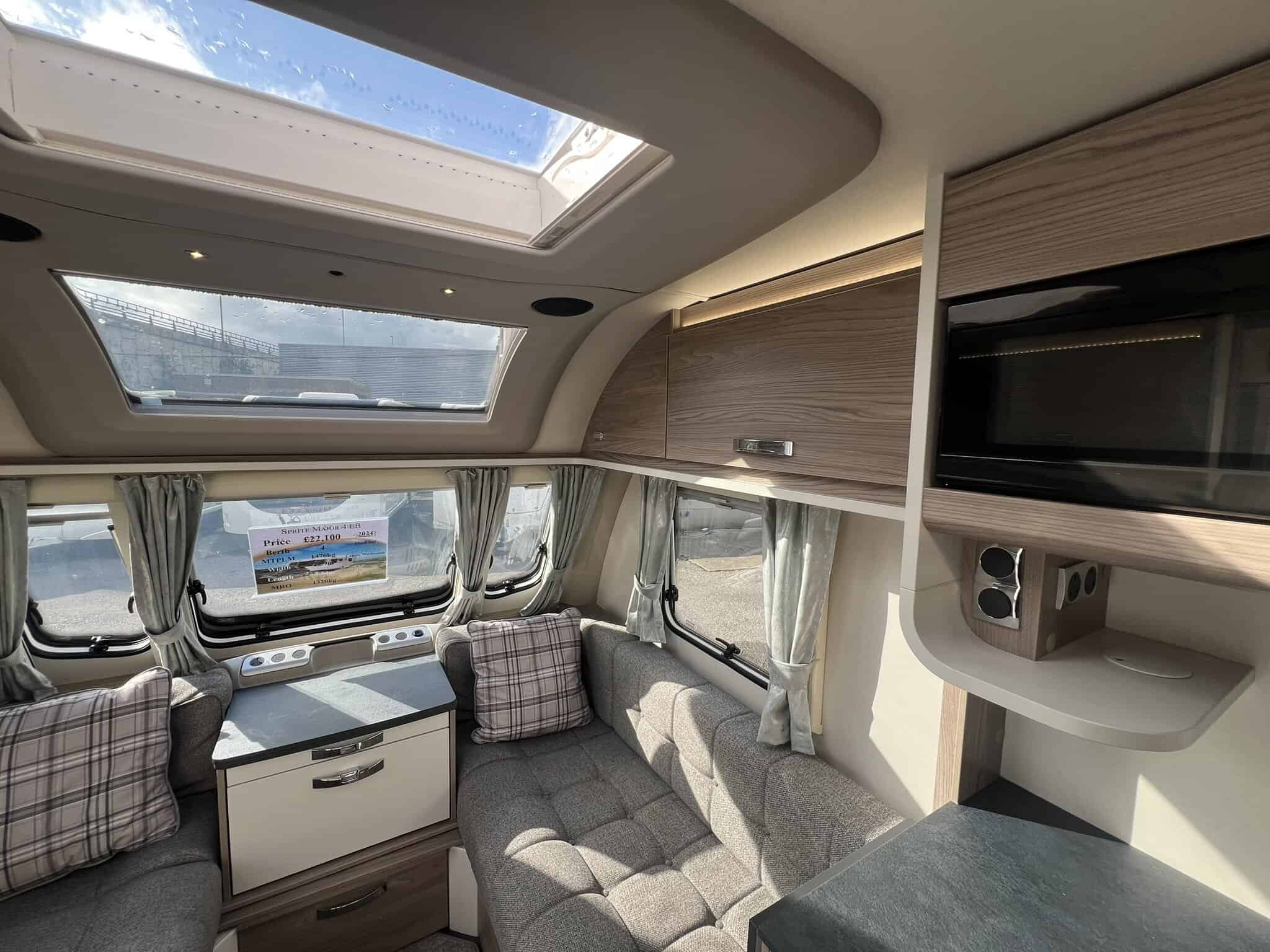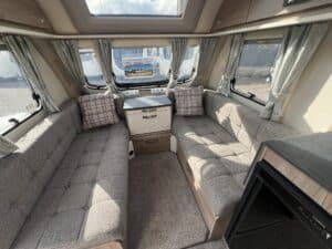 TV sockets are between the cupboards to the right of the door. Those who own the best caravan TV will be pleased to know most people in the lounge can see the set.