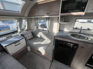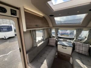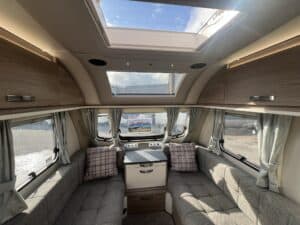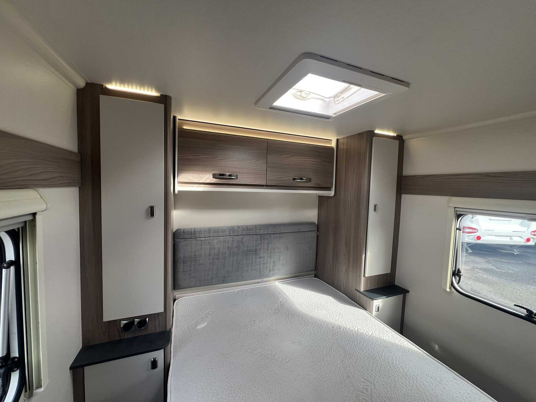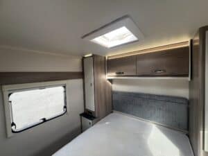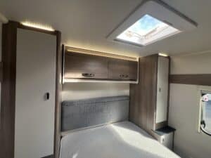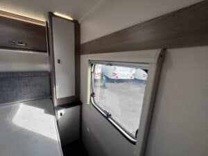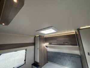 A well-lit interior will be another important factor when you’re choosing the right caravan for you. Here, lots of light gets in, through the sunroof, a Heki and the large windows. Spotlights are built in under the lockers, so you can’t adjust them. But you are well served with USBs, with a pair between each spotlight, and two more in one of the six socket placements near the front chest.