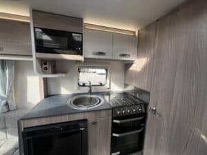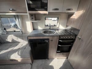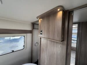 The settees in the lounge are comfortable and provide sufficient room for four, something which is likely to be important in this type of caravan. The foldaway table is stored in a wardrobe next to the rear bed, so it is a bit of a faff getting it out. If you are just having a snack, you might prefer to use the pull-out shelf above the central chest of drawers.