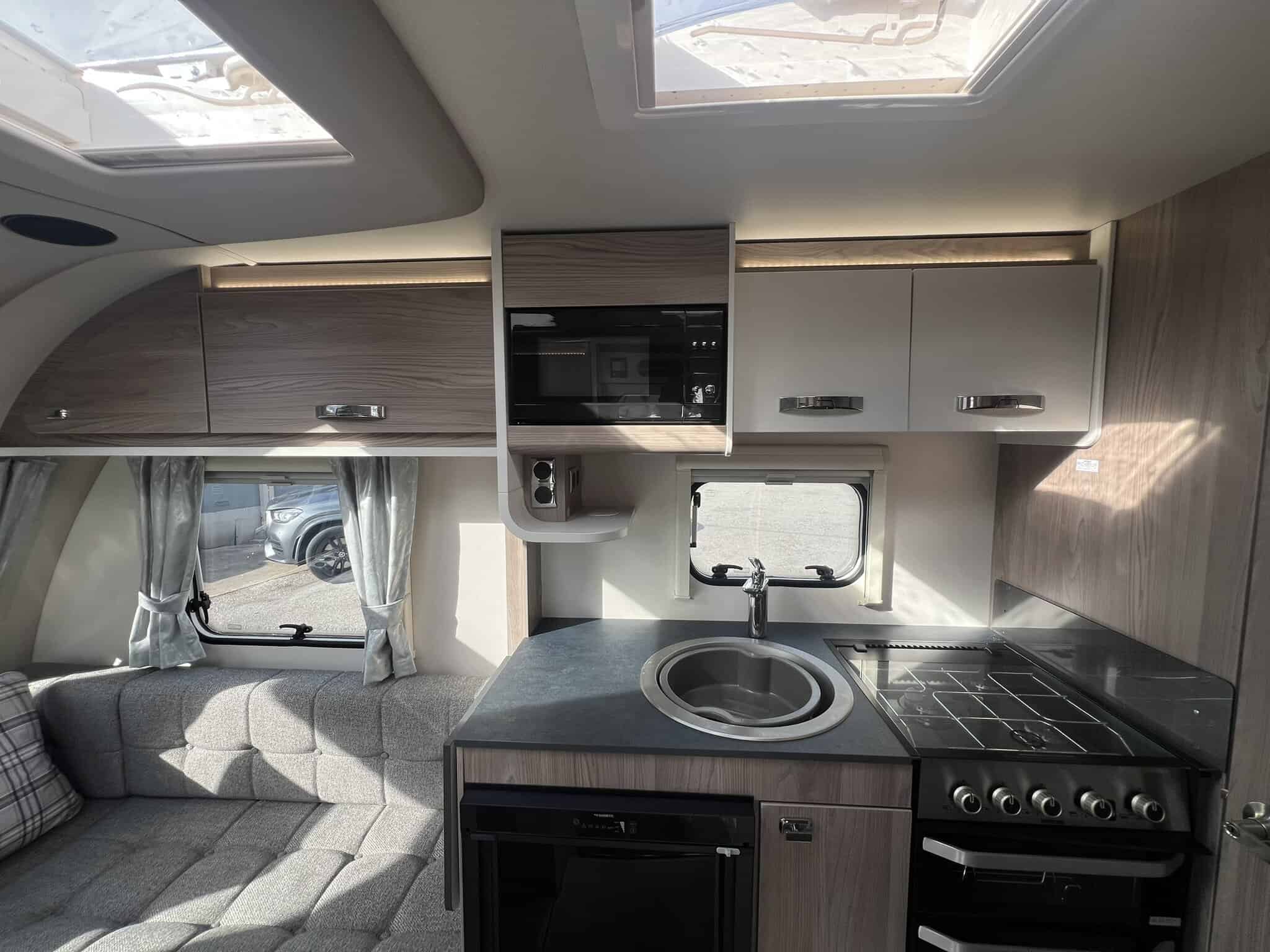 The area is well lit at night. You also get a three-burner gas hob, separate oven and grill, and a flatbed microwave next to the overhead locker. At 83 litres, the fridge might be a bit small for the food of four, however.