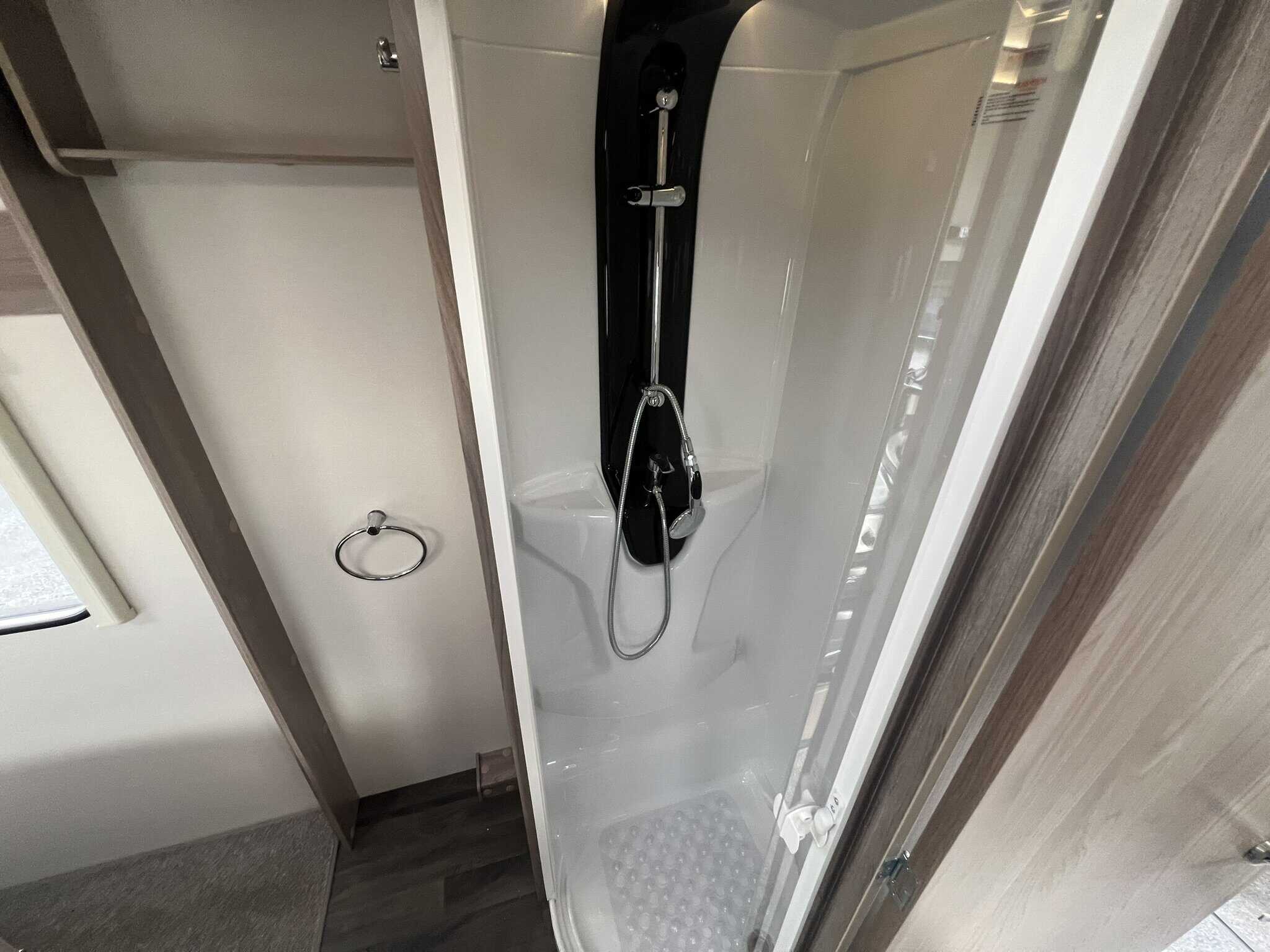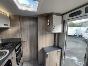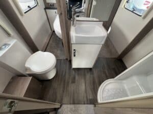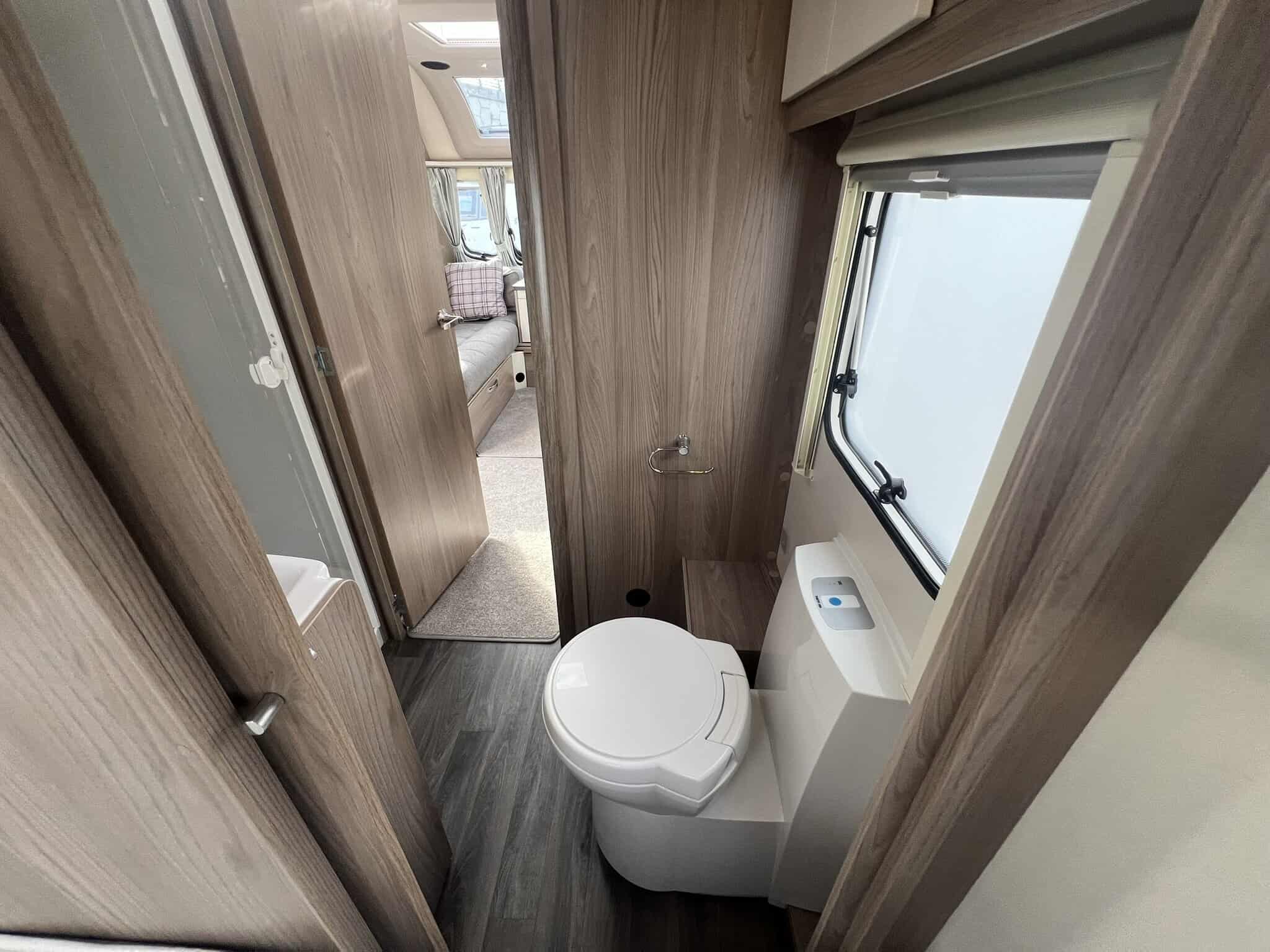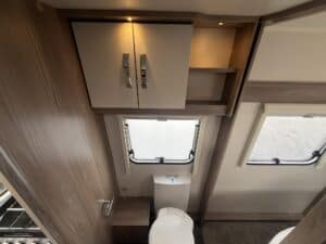The washroom, located across the middle of the caravan, has a basin against a central pillar, with sliding doors either side to get to the bed. It’s a built-in basin, so it is a good size, and it sits in front of a well-lit mirror.