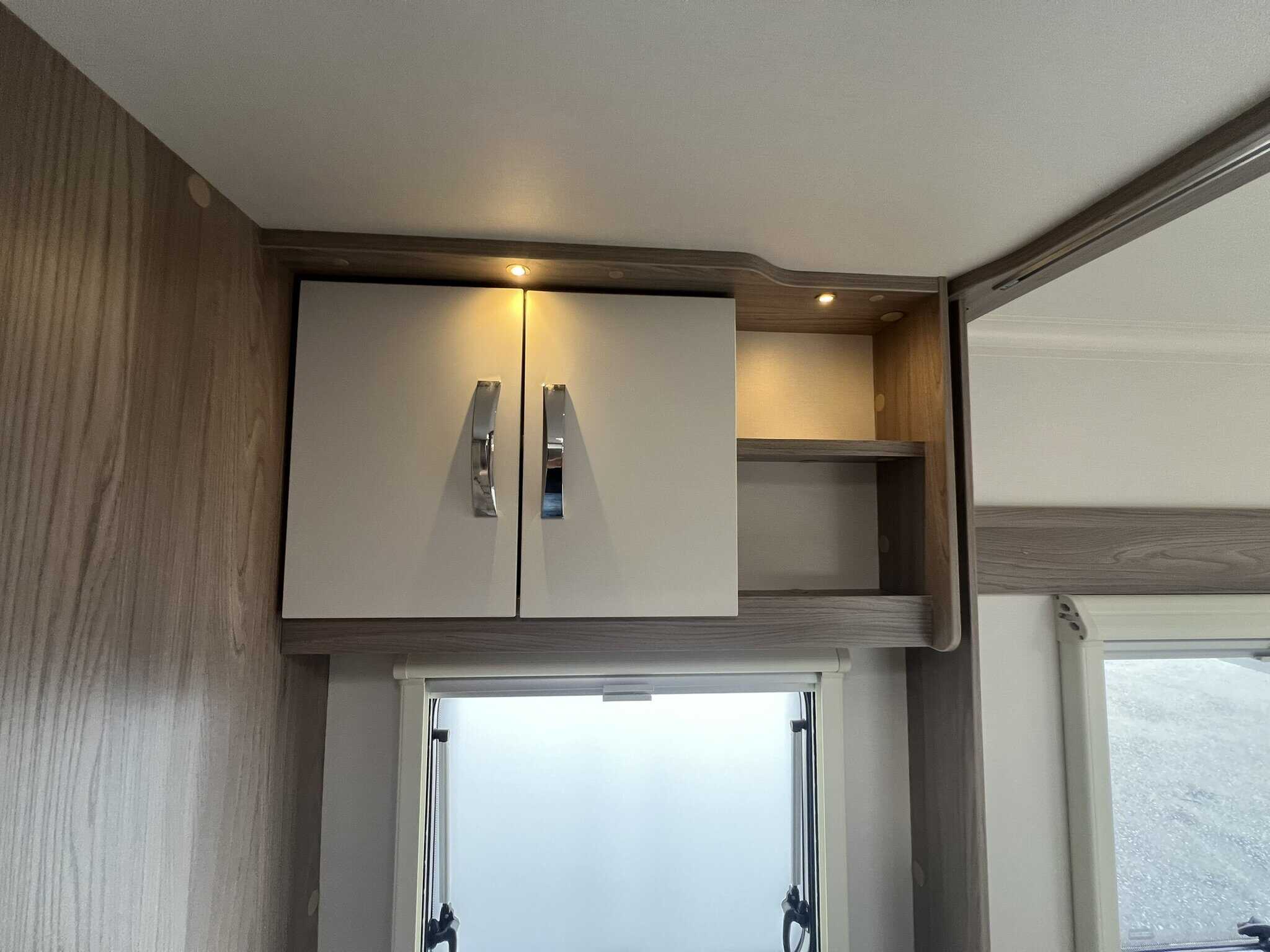 I was impressed that both underseat lockers have full-size internal access flaps – I’ve noticed you don’t often get that, even on pricier caravans. The nearside locker is clear, too, so it’s a shame there is no external access. Up front, there is one overhead locker and a corner locker each side, while the central chest has one drawer, with another small one inside it. A locker door below gives you access to a large area at the front.