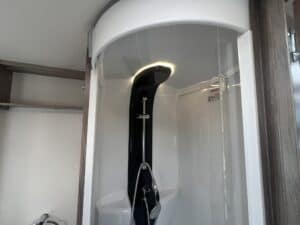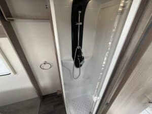 The circular shower is spacious and has a shelf. The wheel arch is visible, but I found it didn’t get in the way. Opposite, the circular toilet is in front of an opaque window. You get a towel ring, but there’s only one roof vent.