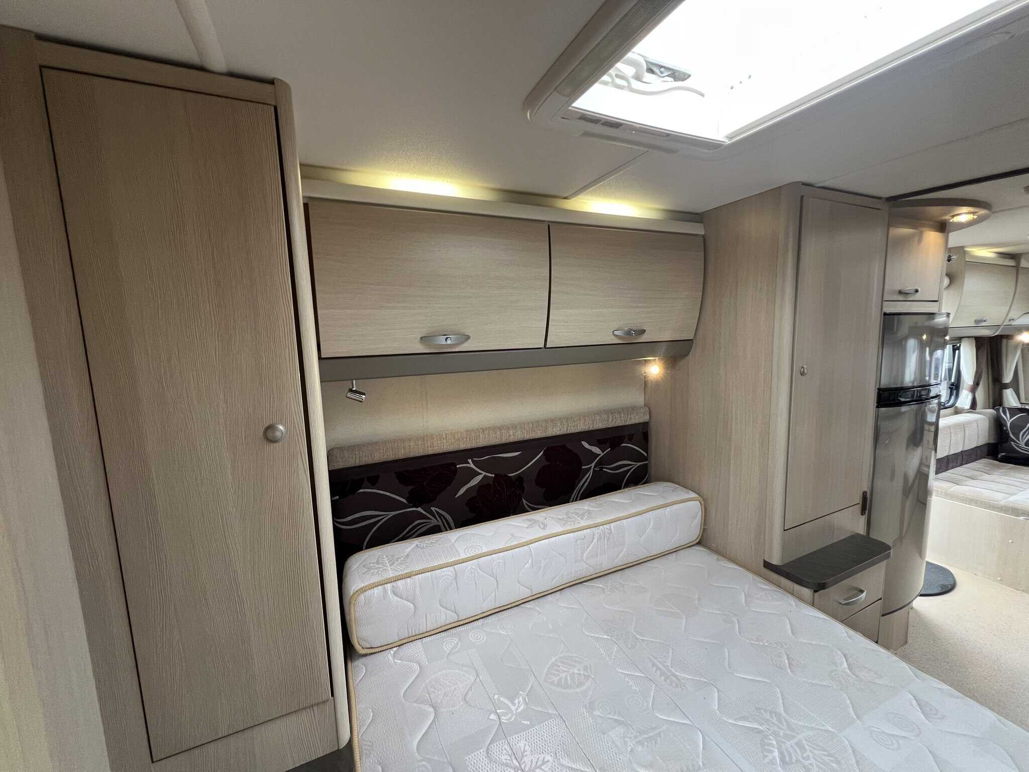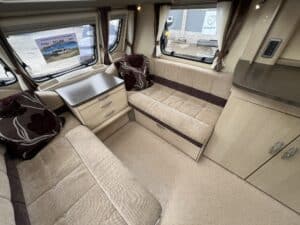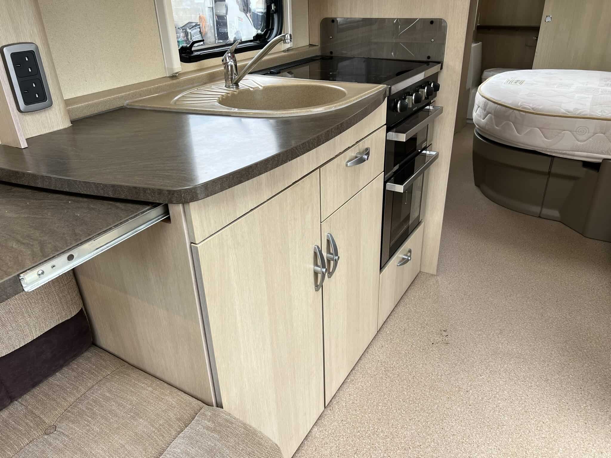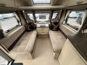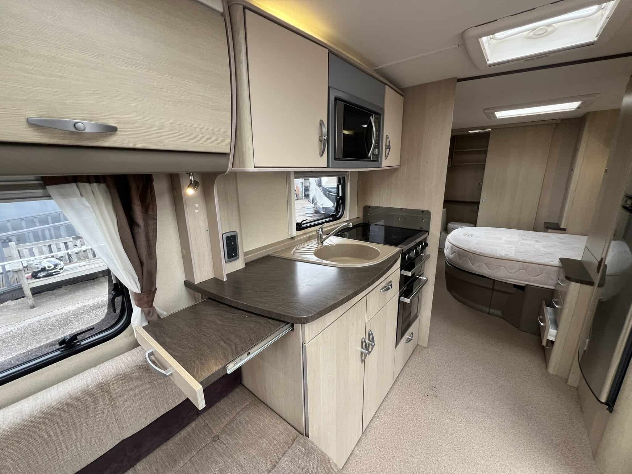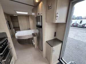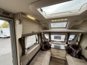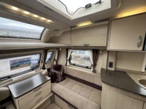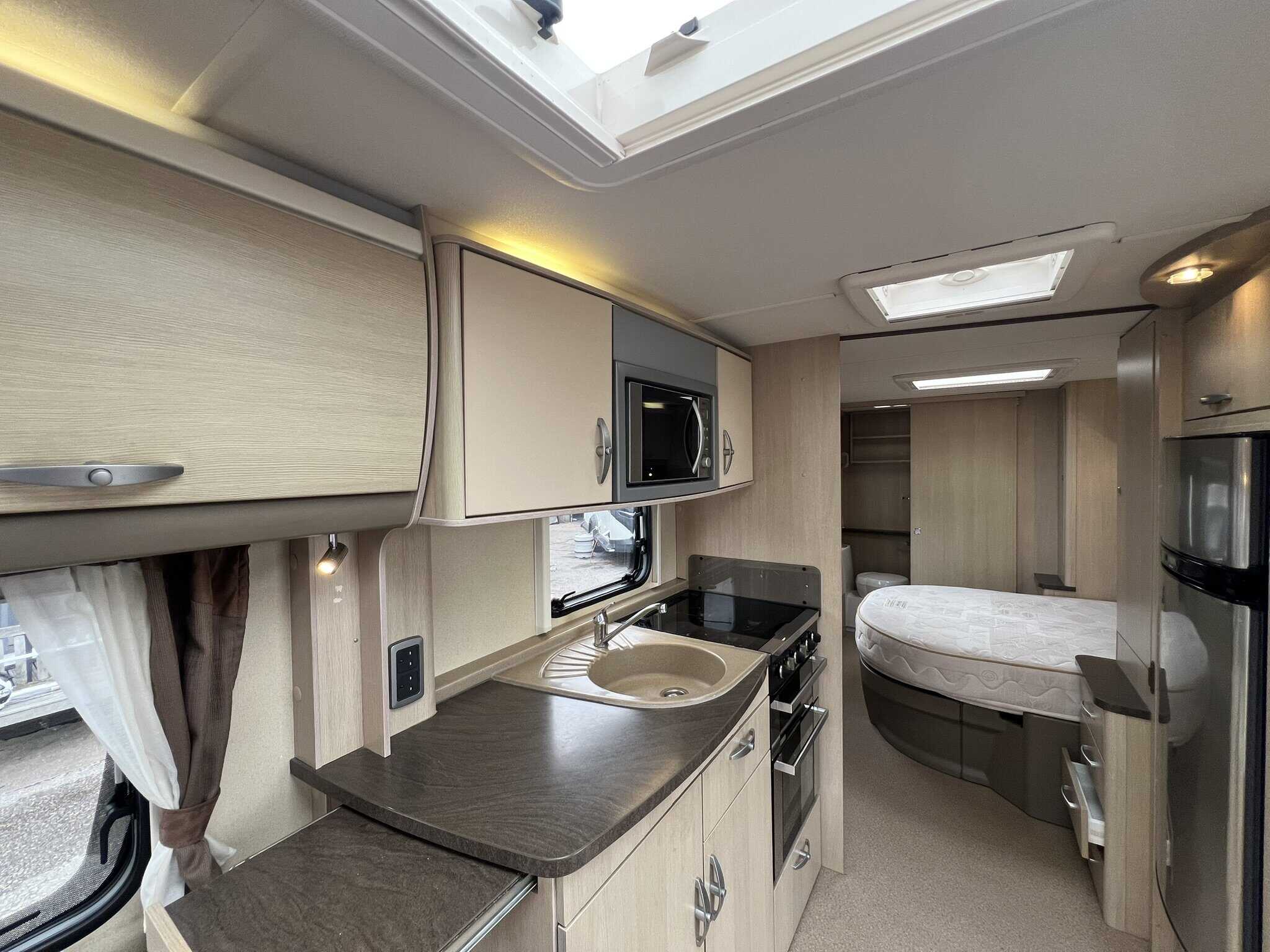 With its practical kitchen with dual-fuel hob, big fridge, light, bright lounge, programmable Alde central heating and spacious rear dressing-showering room, this is a luxury touring caravan.