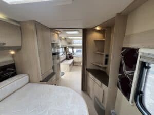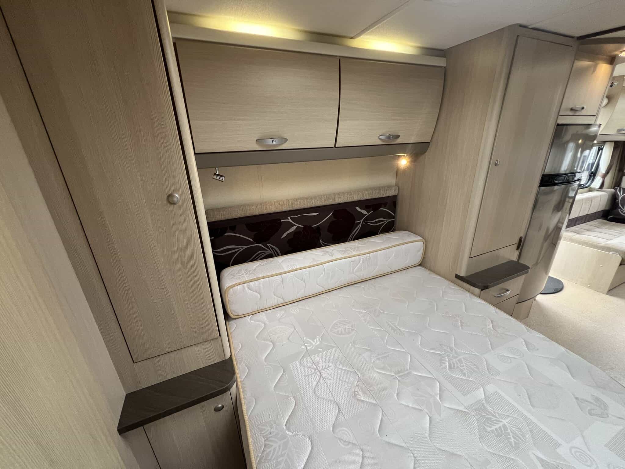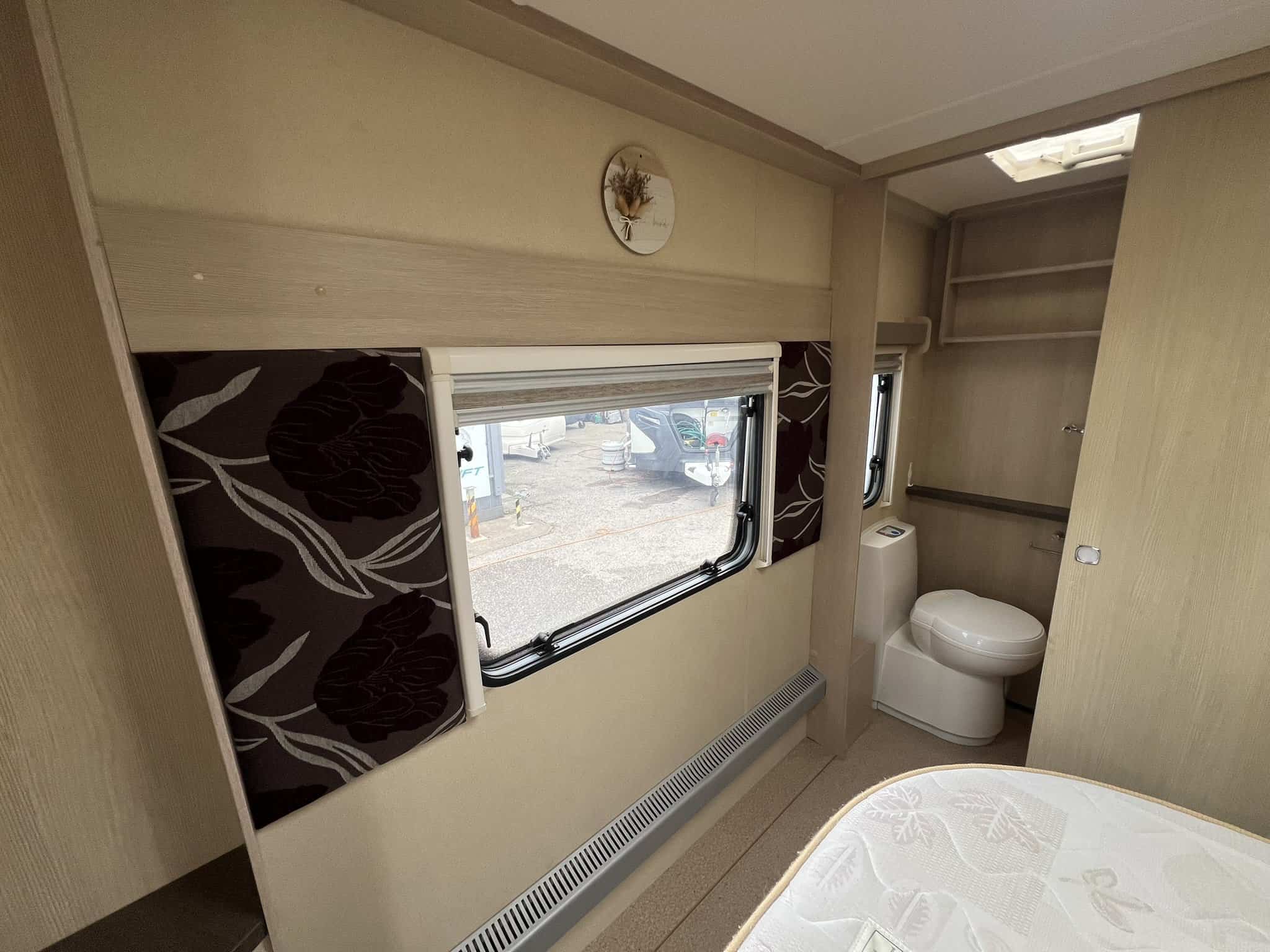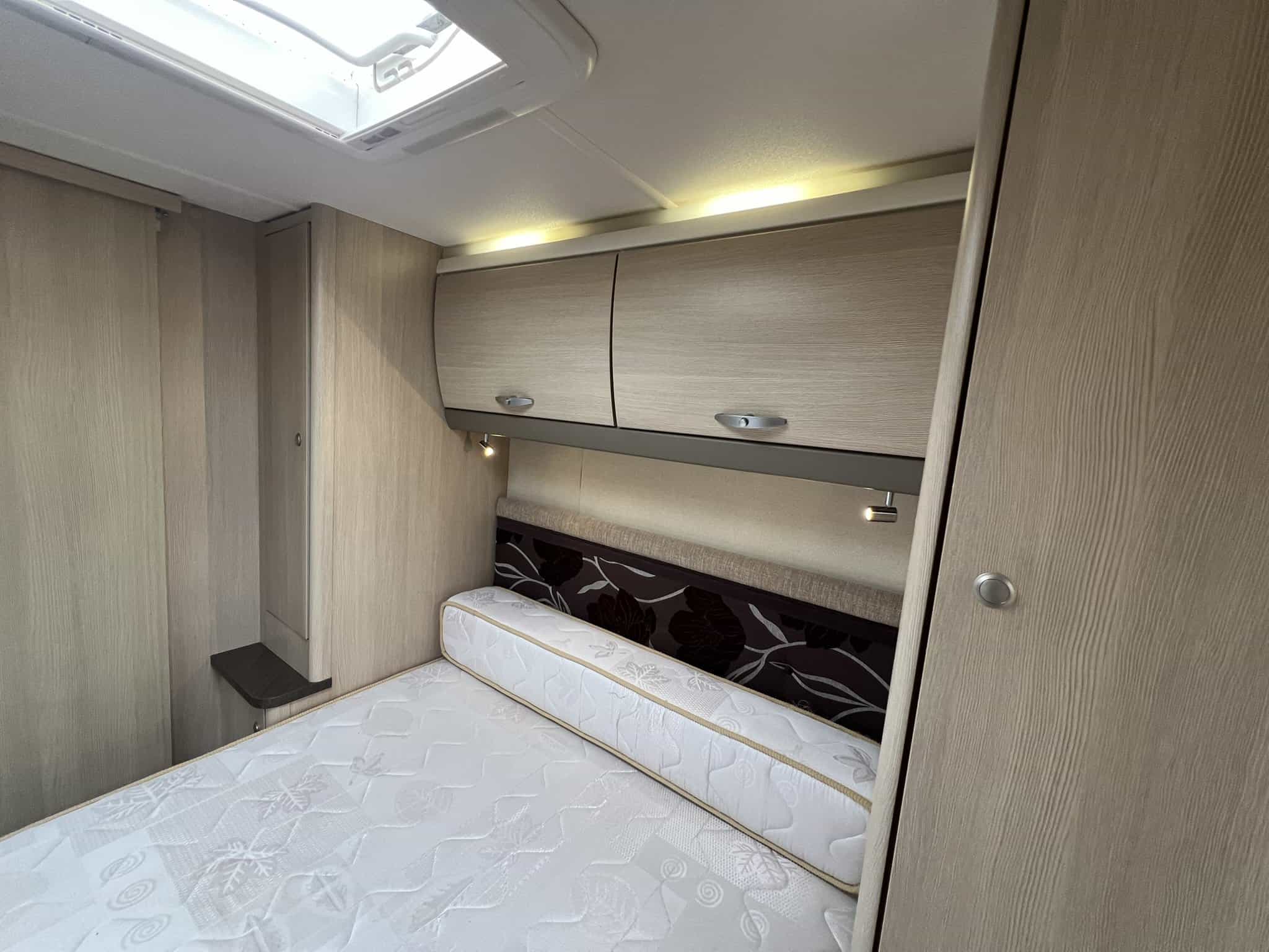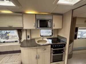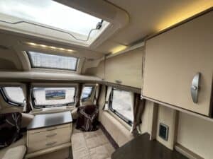 With its practical kitchen with dual-fuel hob, big fridge, light, bright lounge, programmable Alde central heating and spacious rear dressing-showering room, this is a luxury touring caravan.