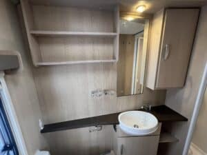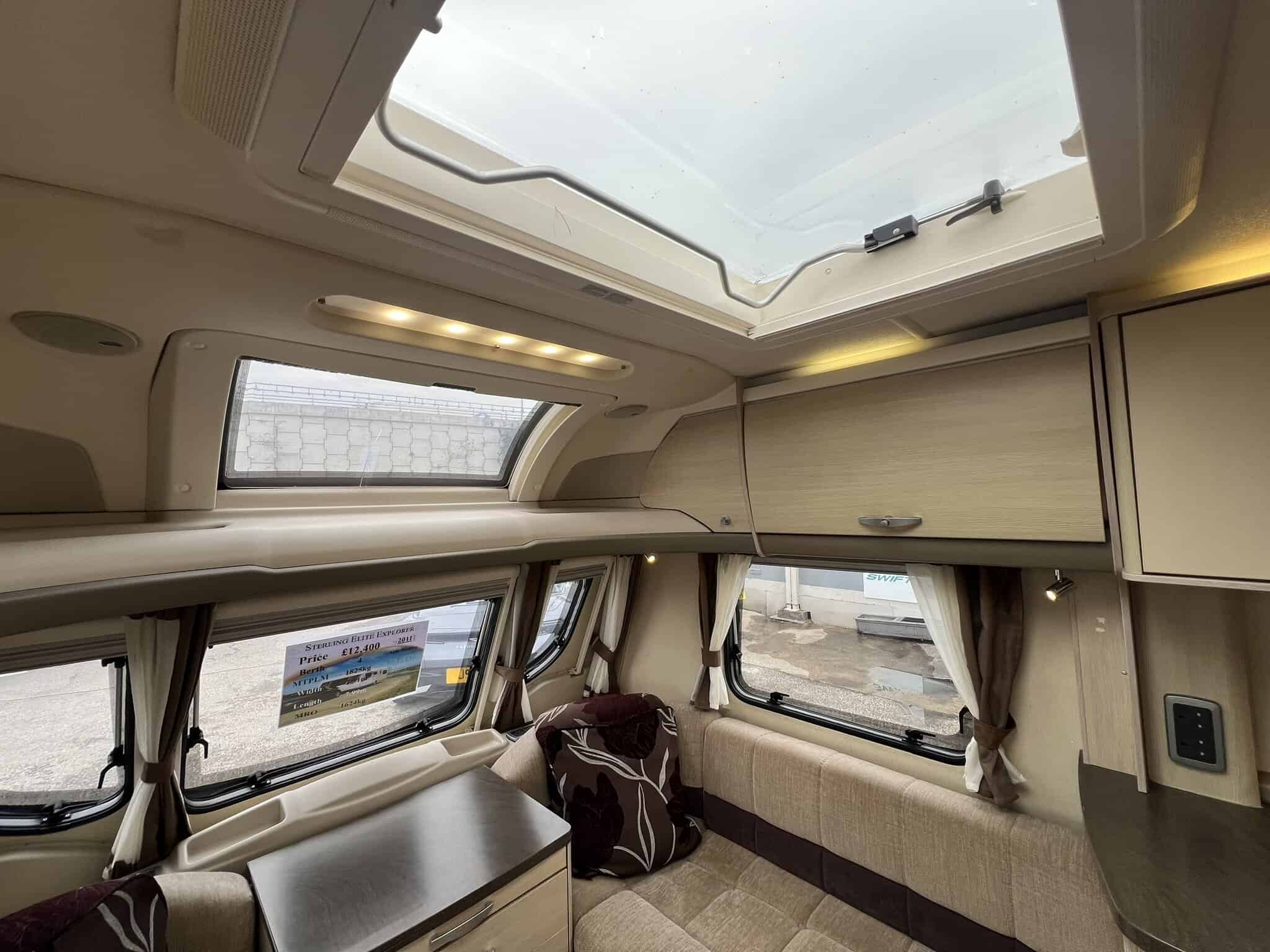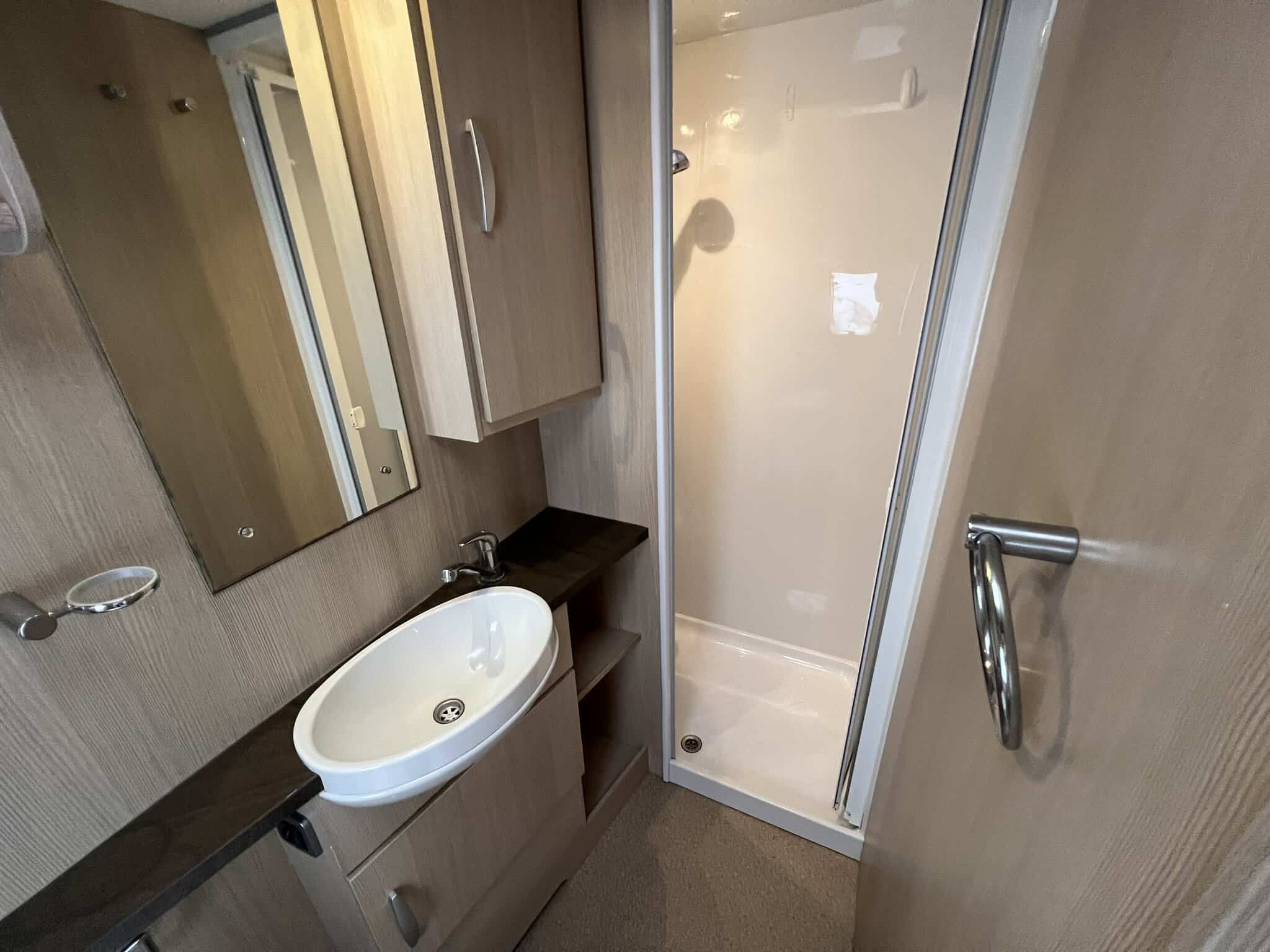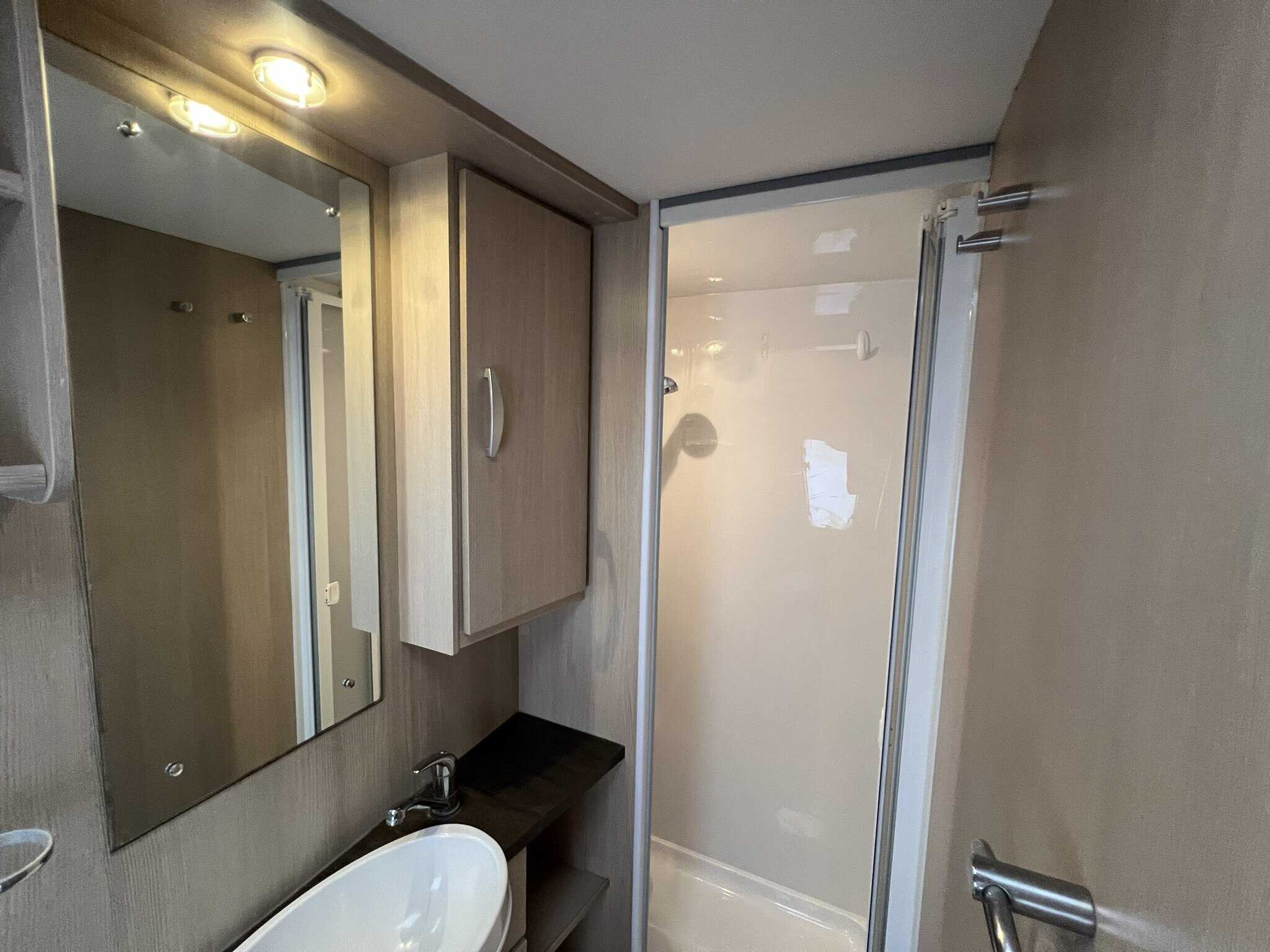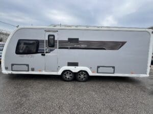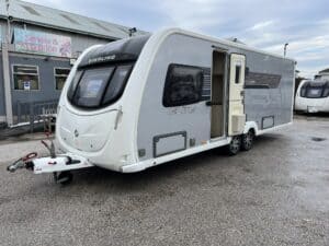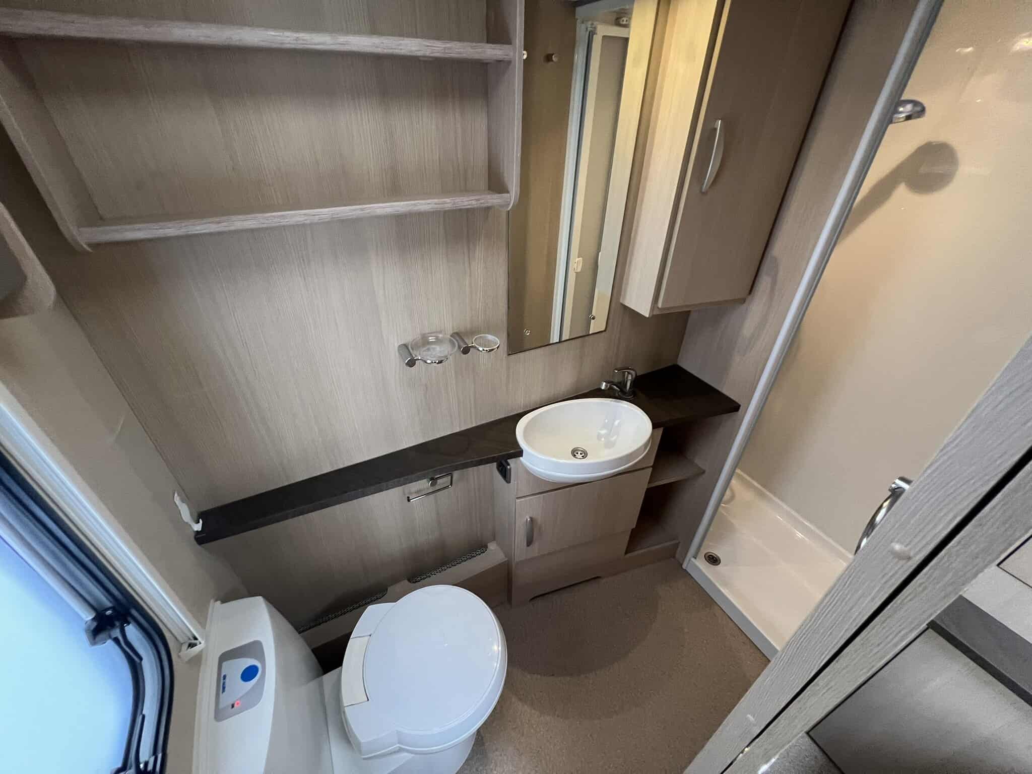 With its practical kitchen with dual-fuel hob, big fridge, light, bright lounge, programmable Alde central heating and spacious rear dressing-showering room, this is a luxury touring caravan.