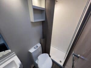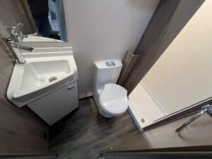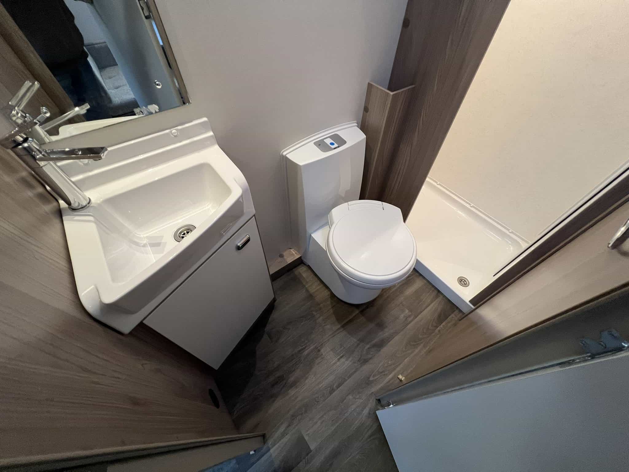12. Boutique washroom with washbasin, cupboard, mirror, and Ecocamel Jetstorm showerhead for water-saving showers. Plus, NEW White Stipple marble effect shower wallboard and Thetford toilet with electric flush