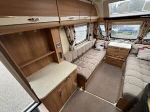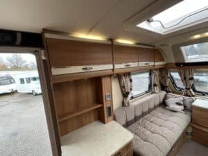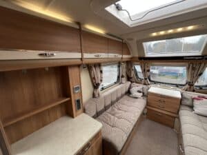 The lounge space in this two-berth is comfortable and cosy for up to four people. A sunroof is fitted as standard and does a good job of flooding the lounge area with light by day. At night, over-locker lighting creates a classy internal ambience. The reduction in overall width is barely noticeable in terms of legroom for anyone seated on the sofas.
