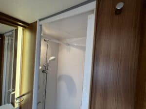 One of the key kit upgrades is Alde’s wet heating system, which features radiators in the front seat boxes and a heated rail in the washroom. Alde’s touch control panel is easy to use, as are all other aspects of setting the Swift up.