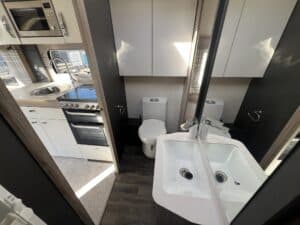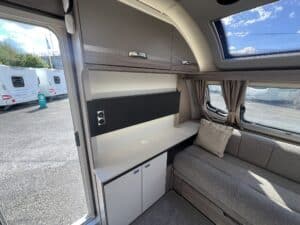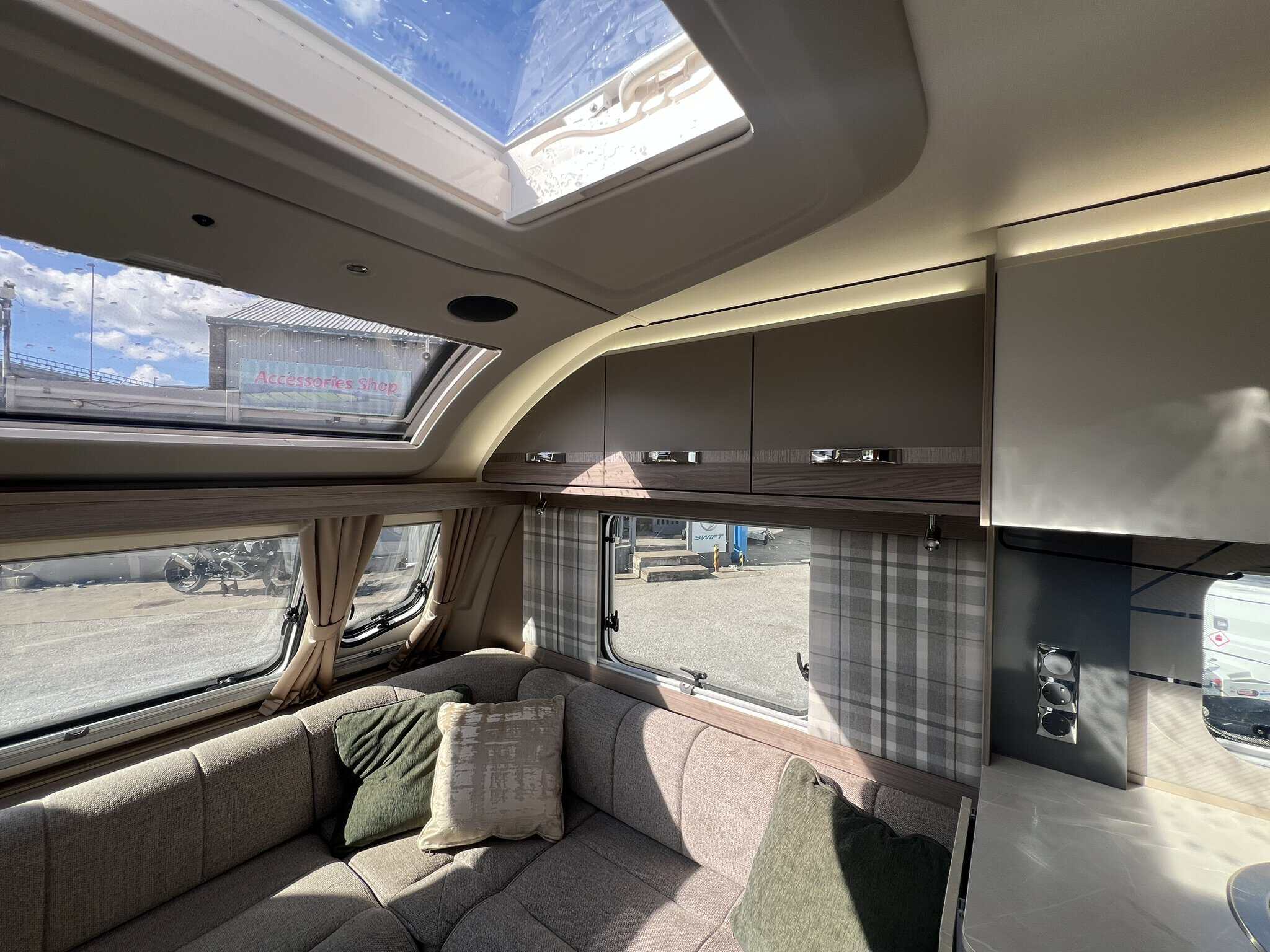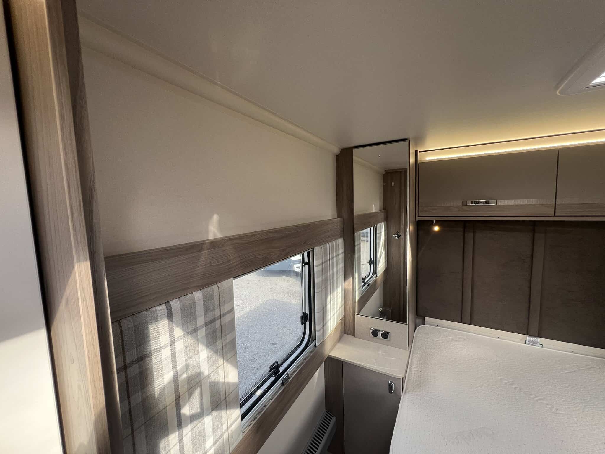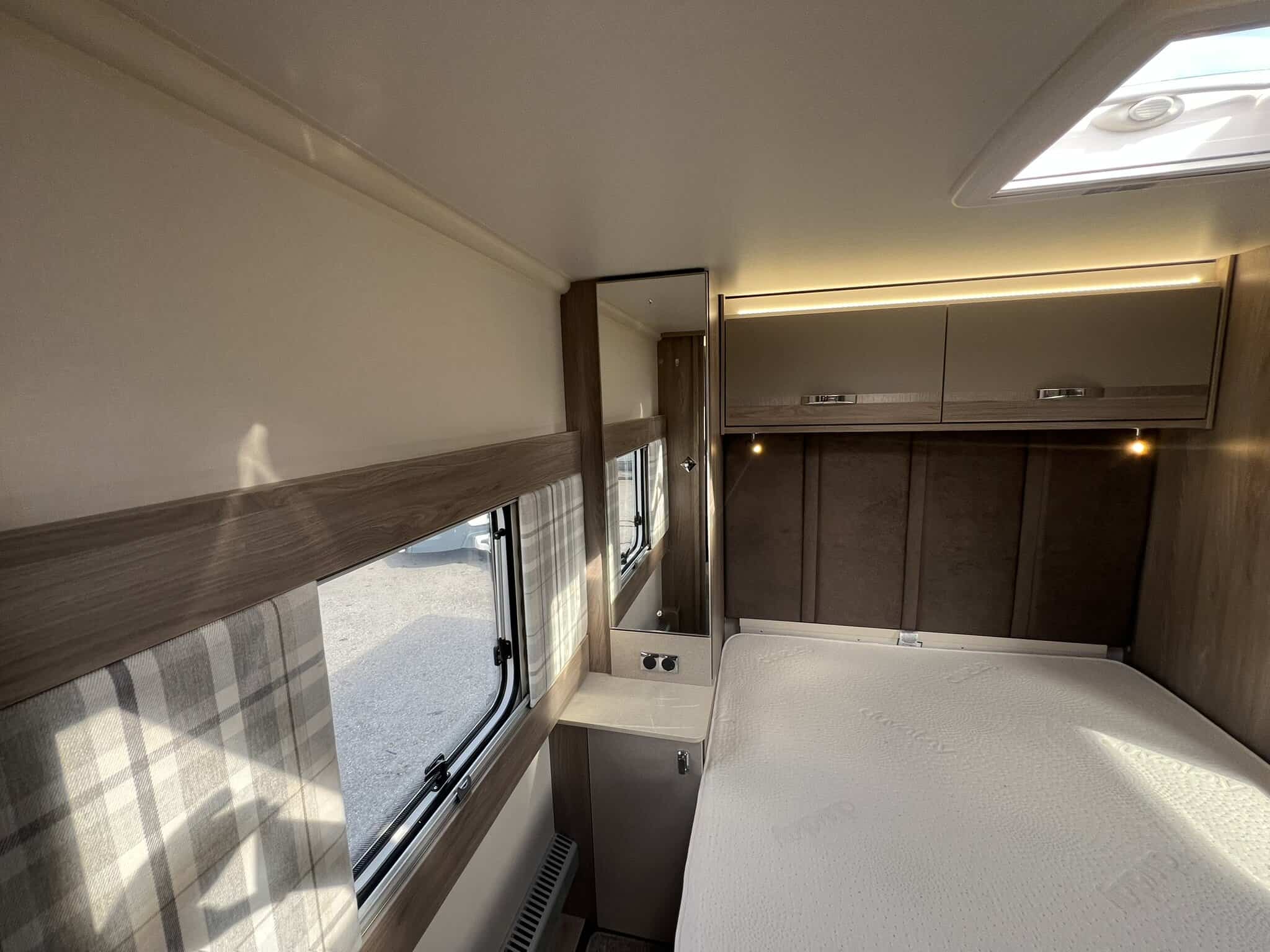 The 2023 redesign encompasses striking new exterior graphics, triple flush-fitting opening windows and LED front marker lights. The lounge features a refreshed, modern soft furnishing scheme, new upper locker doors and grey oak effect, scratch resistant floor lino. The washroom has also undergone a redesign and features new handleless furniture and storage units.