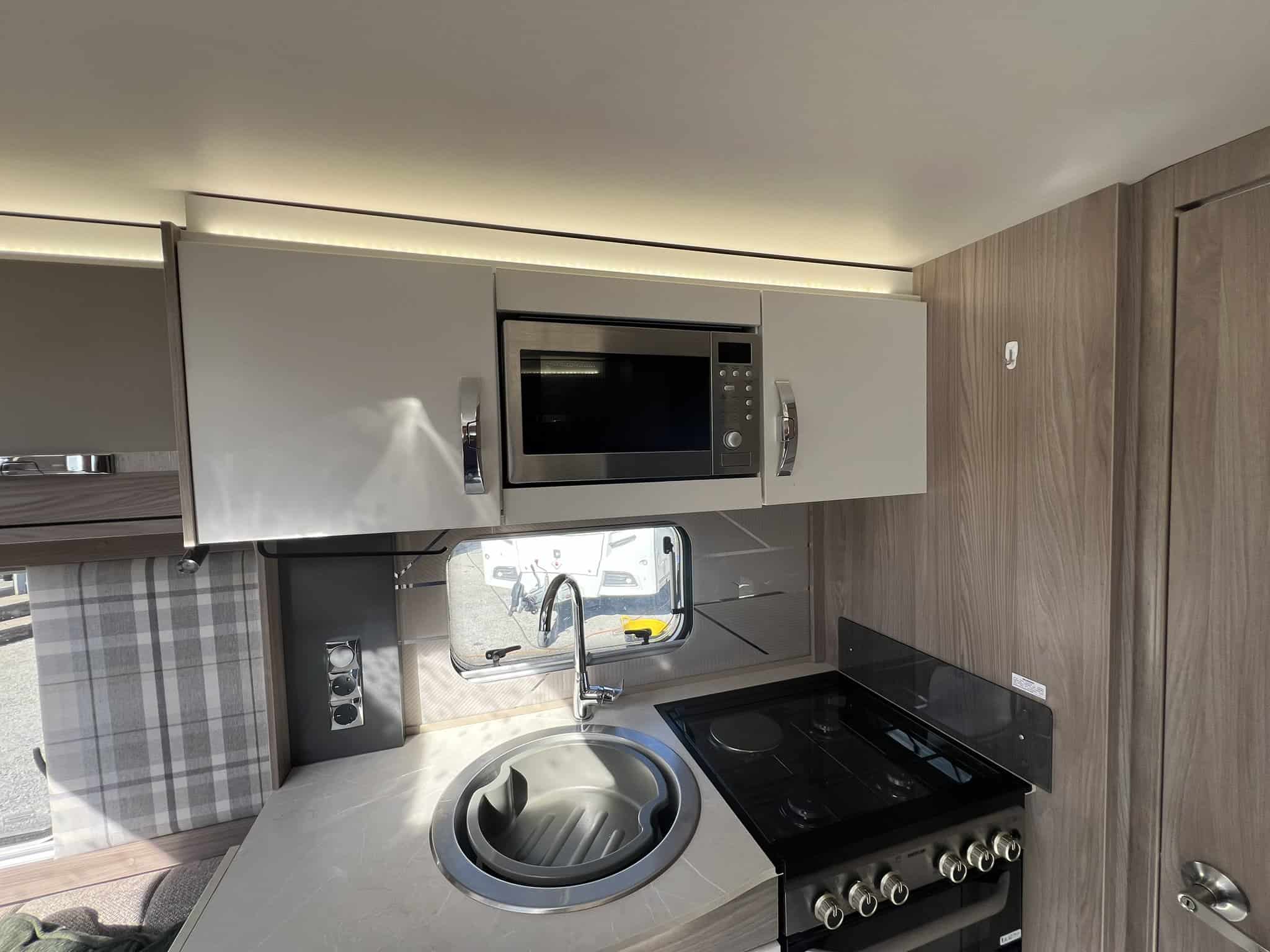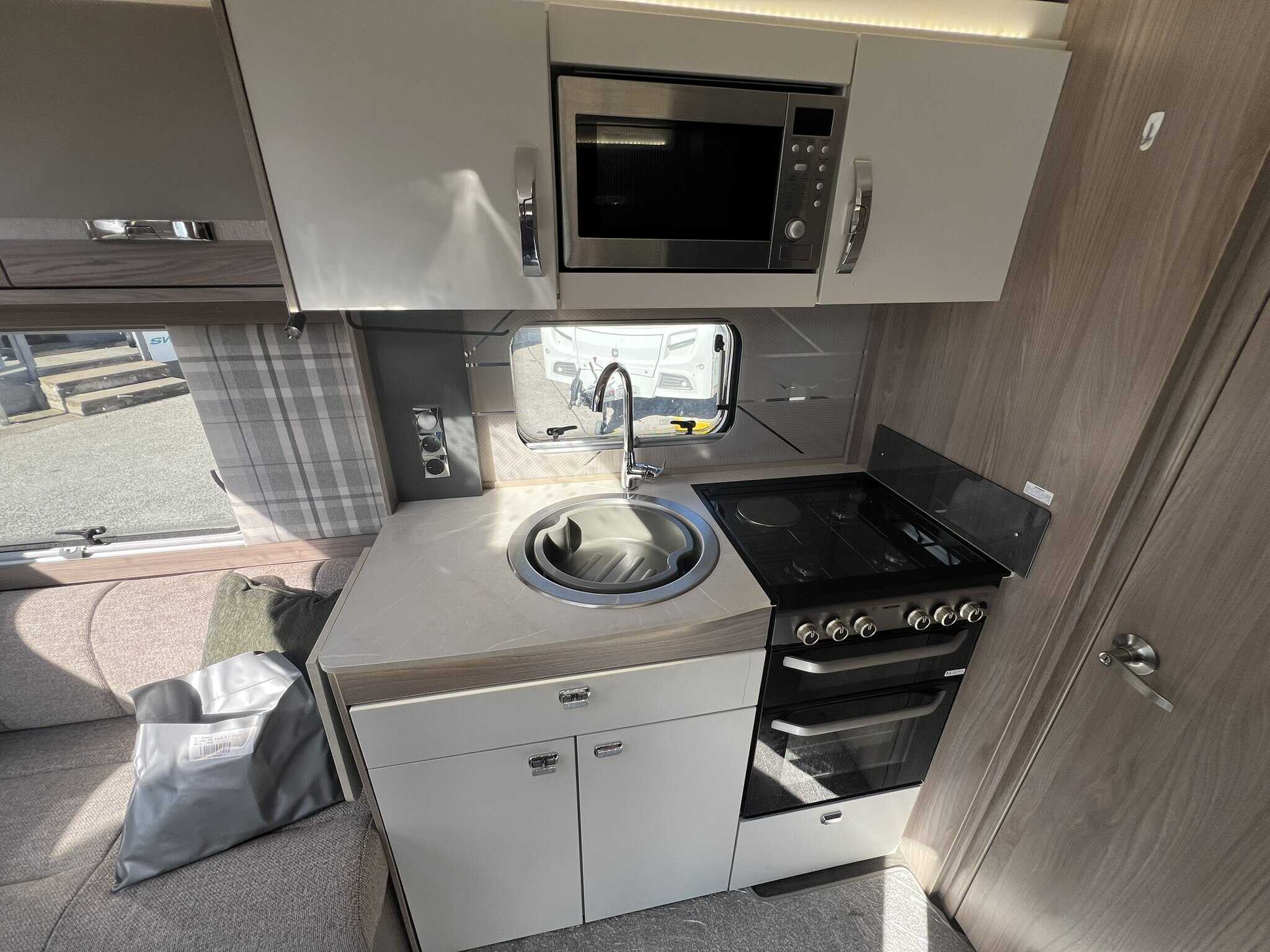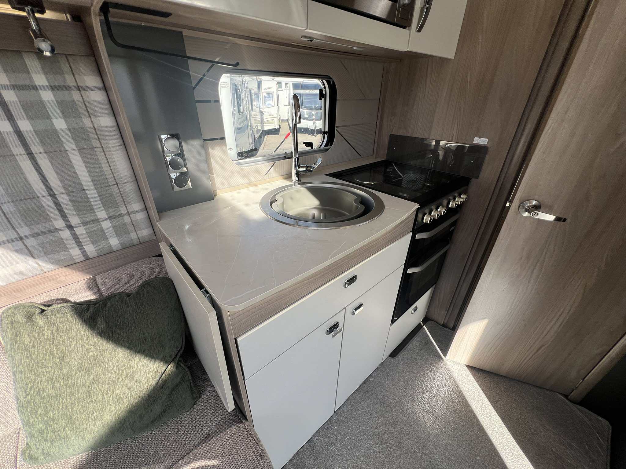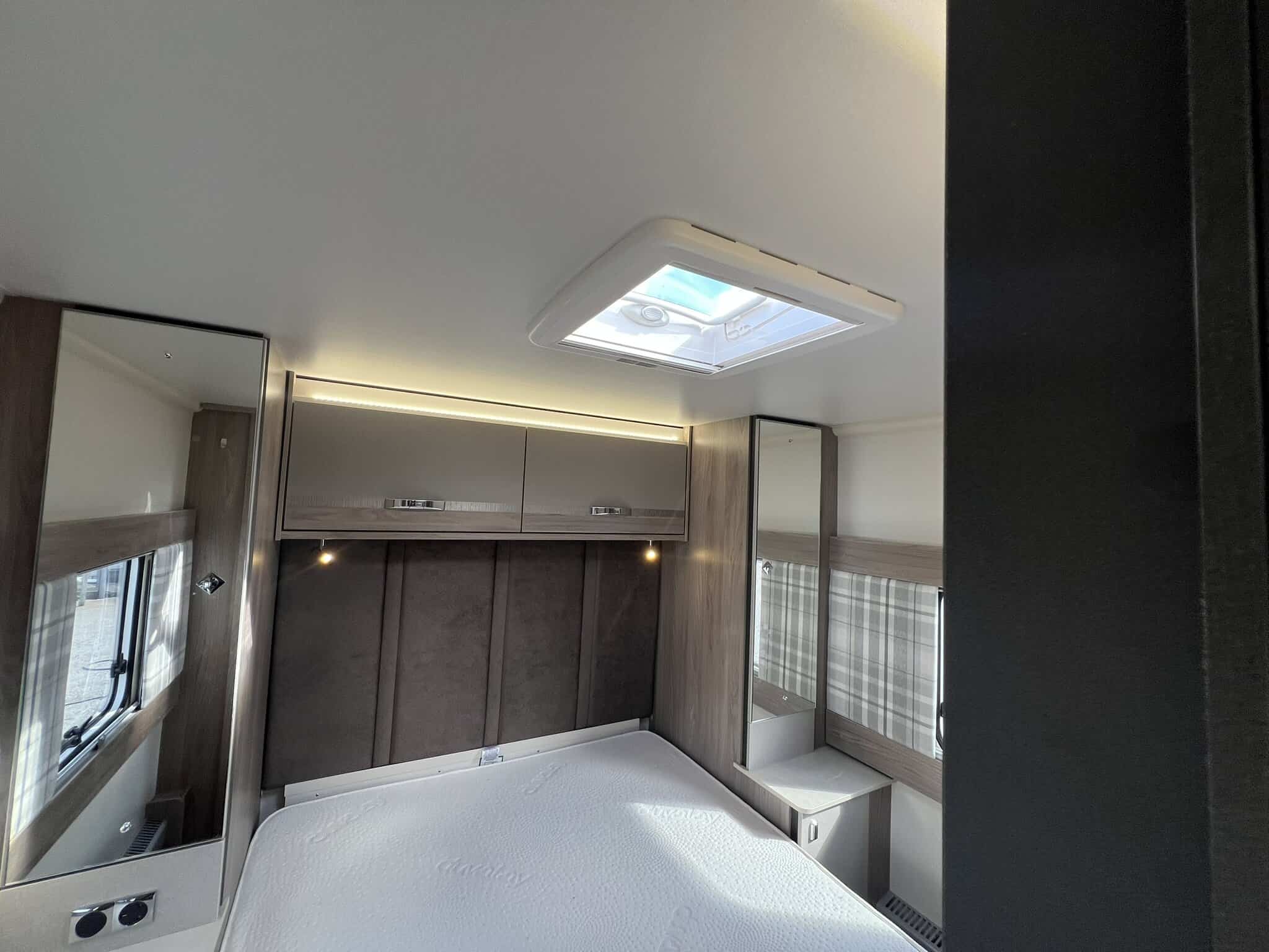 The 2023 redesign encompasses striking new exterior graphics, triple flush-fitting opening windows and LED front marker lights. The lounge features a refreshed, modern soft furnishing scheme, new upper locker doors and grey oak effect, scratch resistant floor lino. The washroom has also undergone a redesign and features new handleless furniture and storage units.