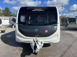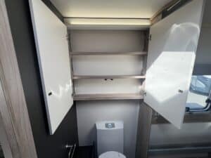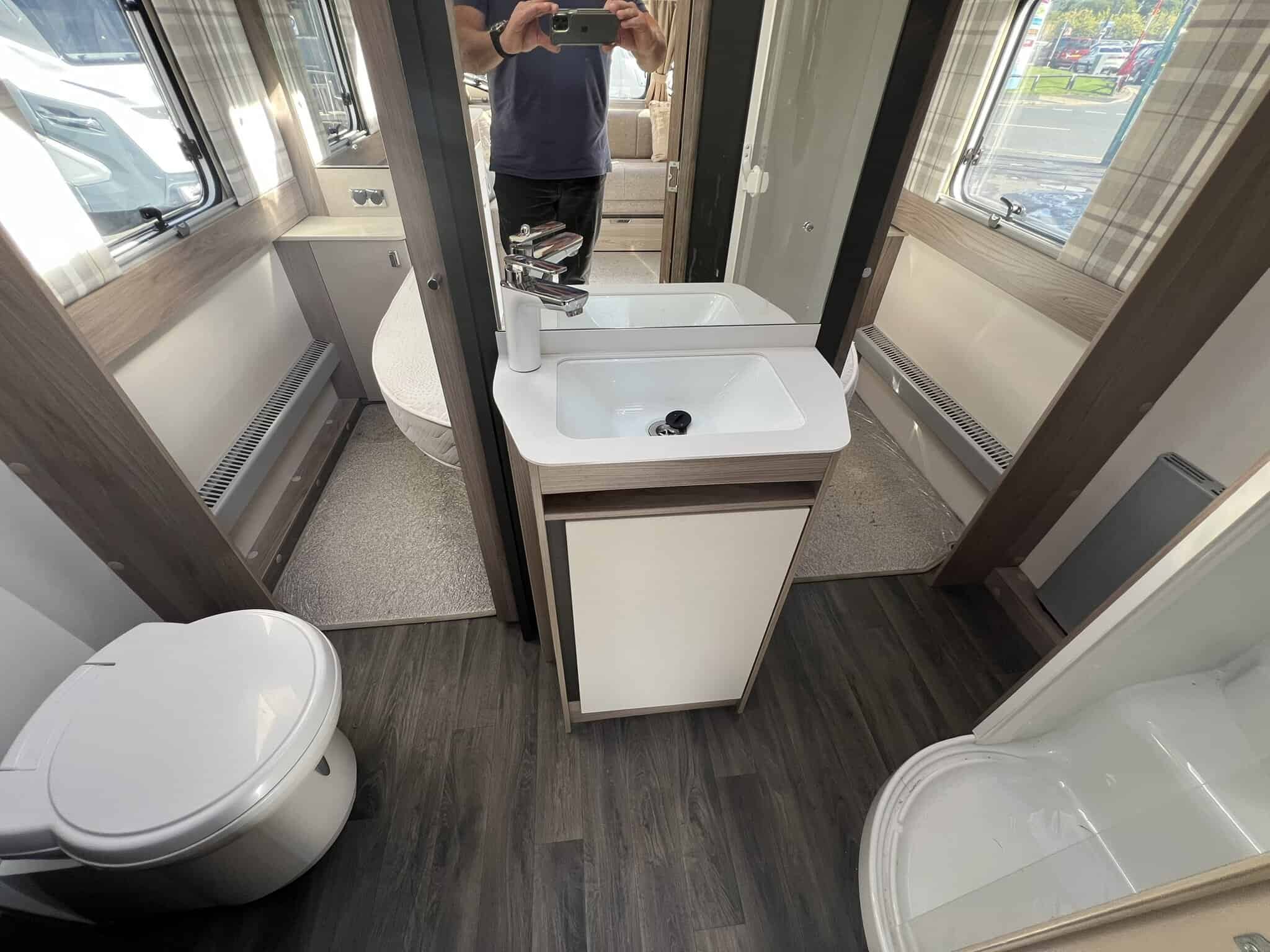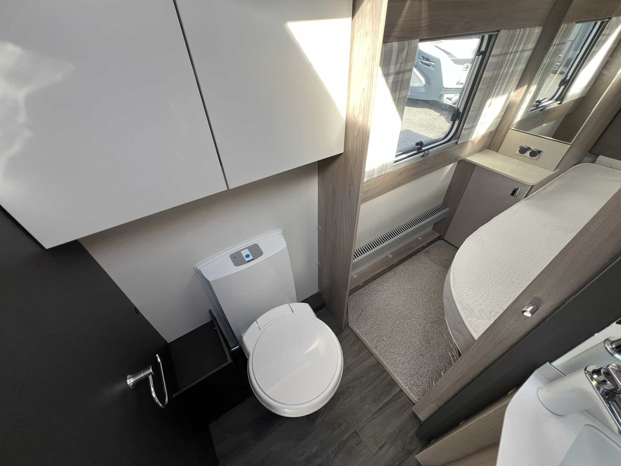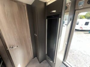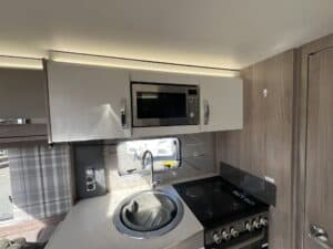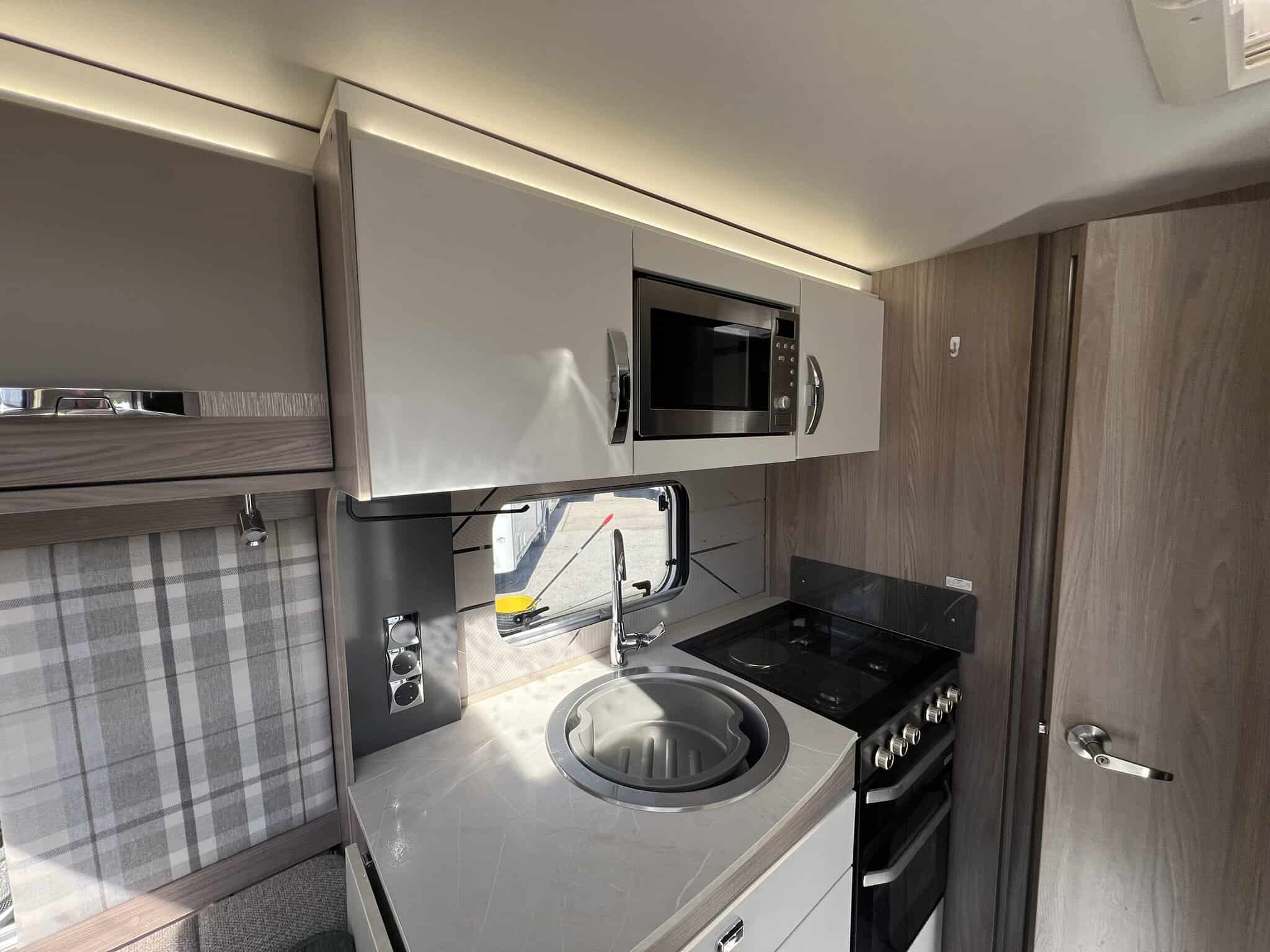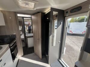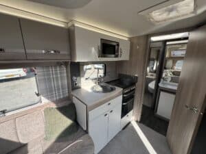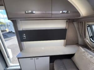 The 2023 redesign encompasses striking new exterior graphics, triple flush-fitting opening windows and LED front marker lights. The lounge features a refreshed, modern soft furnishing scheme, new upper locker doors and grey oak effect, scratch resistant floor lino. The washroom has also undergone a redesign and features new handleless furniture and storage units.
