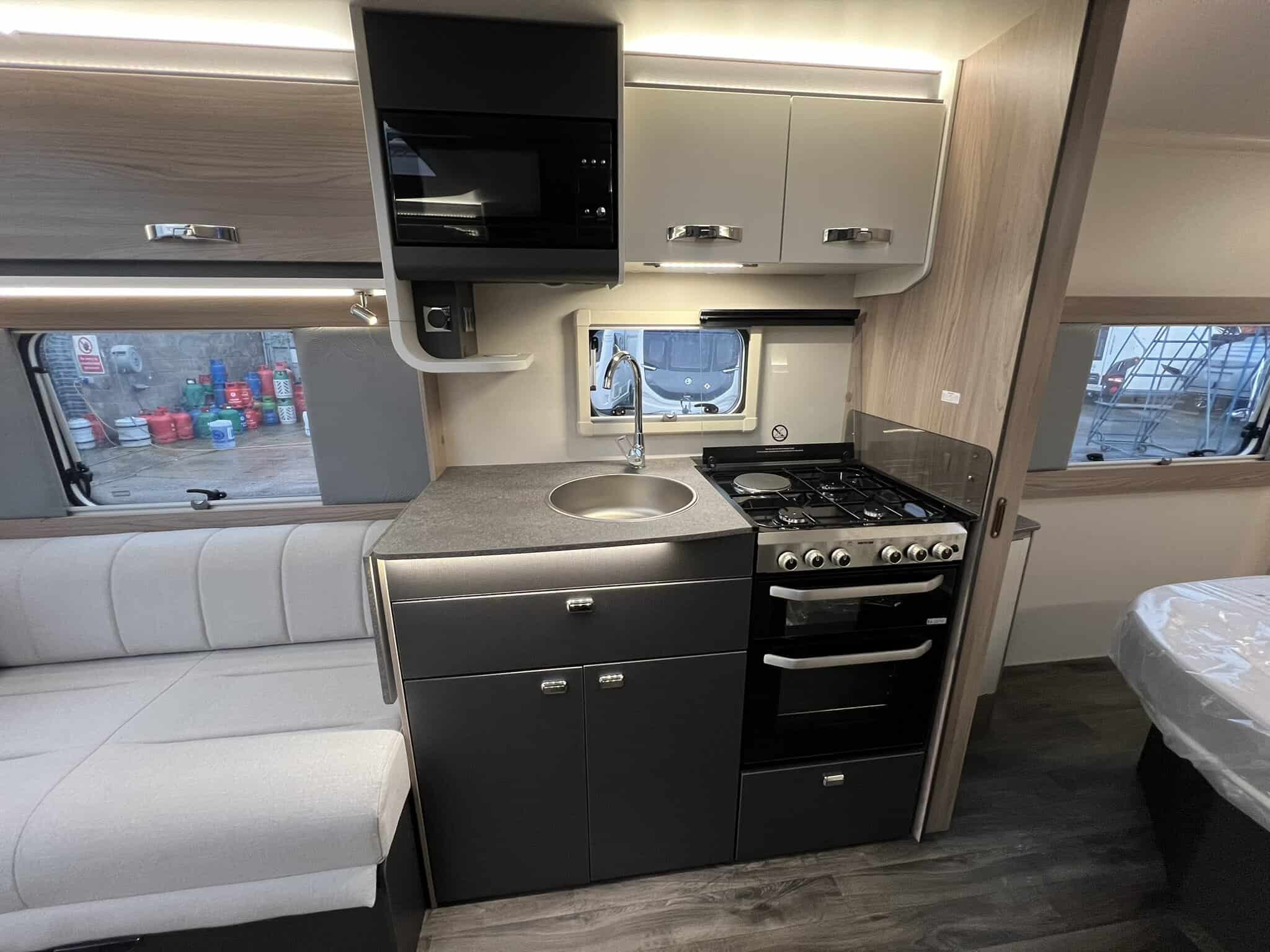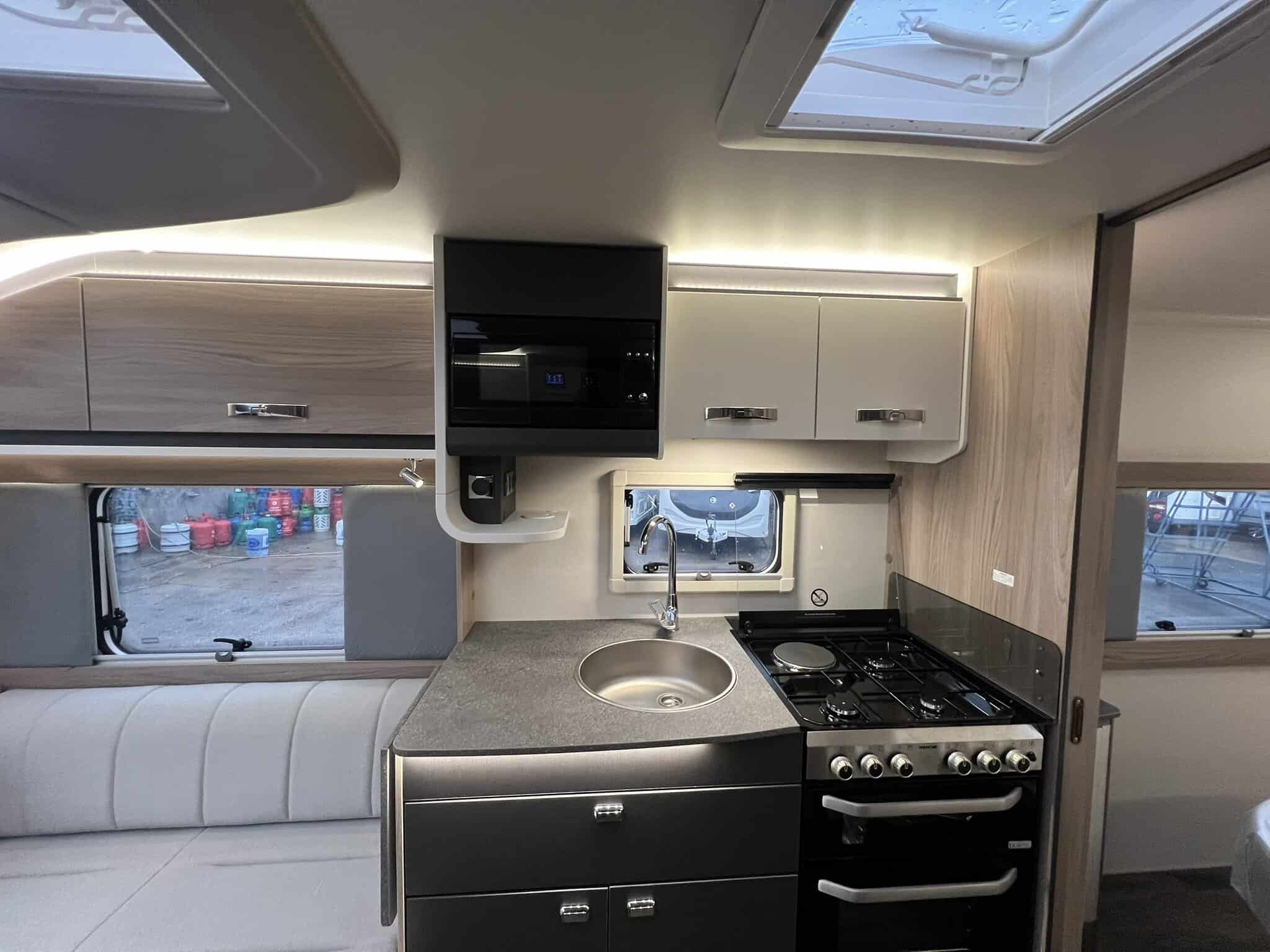 - 09. Thetford oven/grill with three-burner gas hob and one electric hotplate. Hob features a glass lid with auto gas shut-off functionality