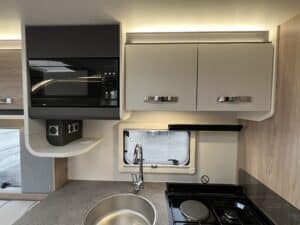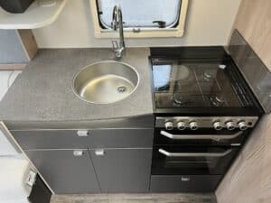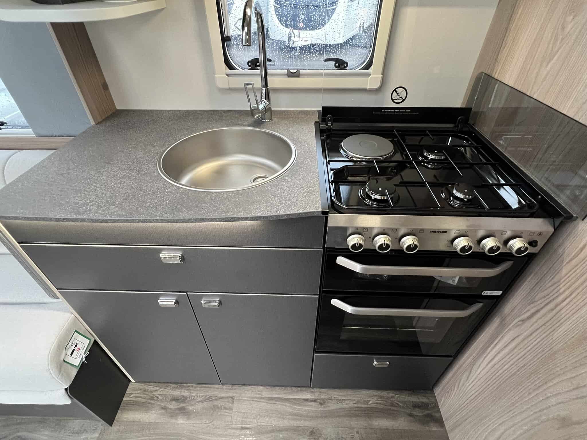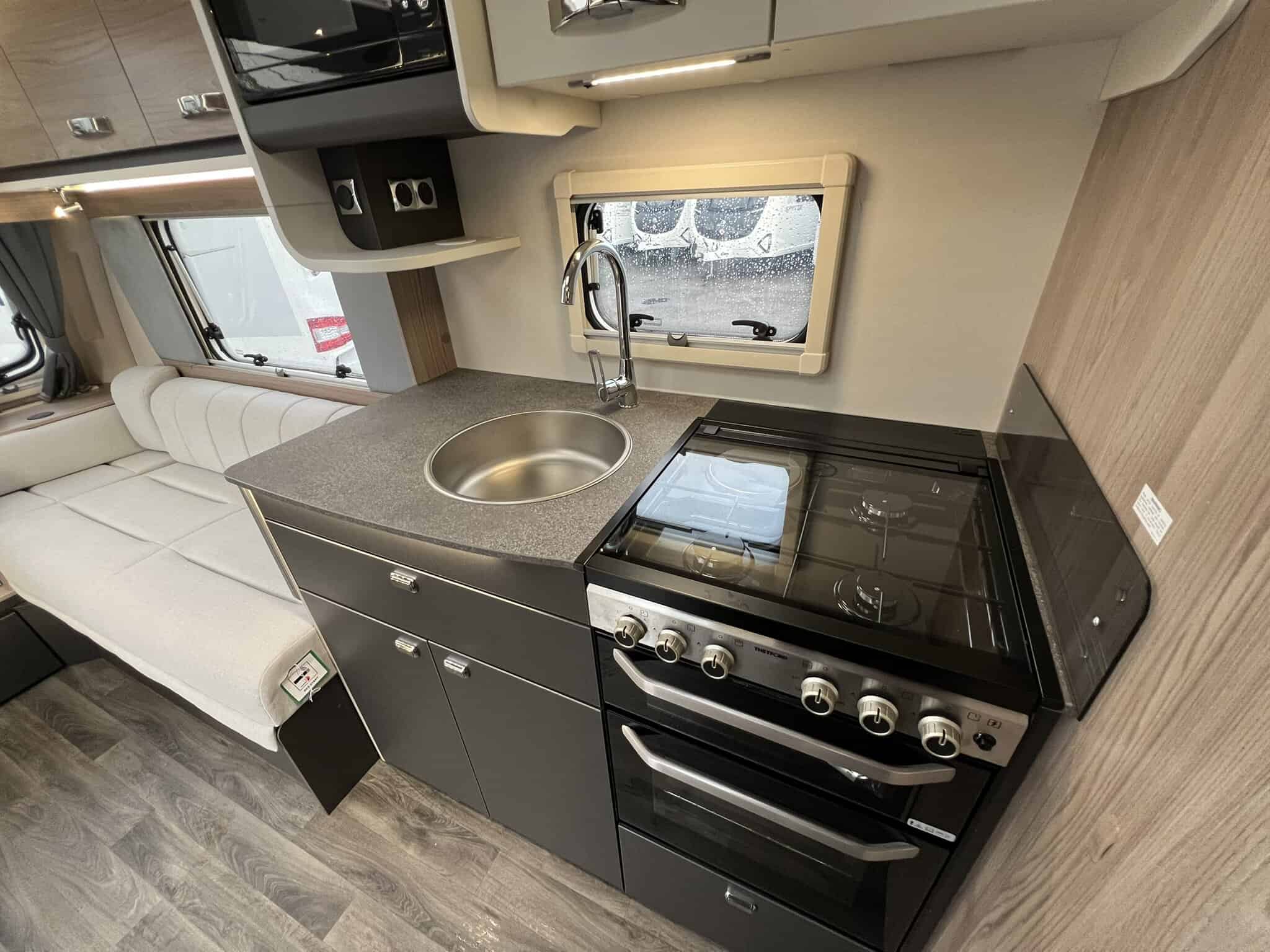 - 09. Thetford oven/grill with three-burner gas hob and one electric hotplate. Hob features a glass lid with auto gas shut-off functionality