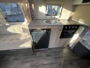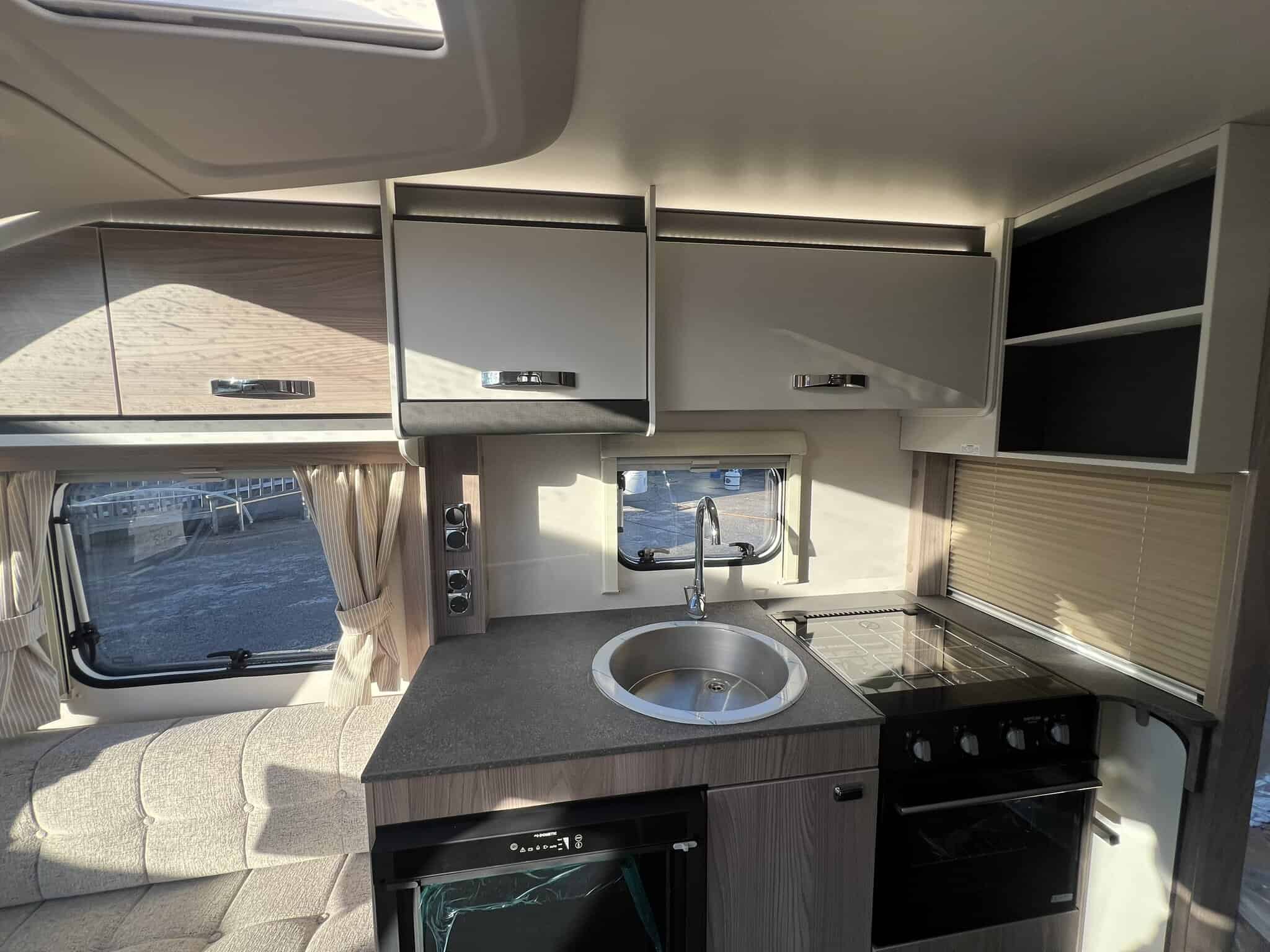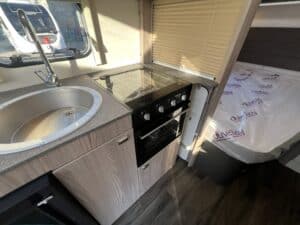 10. Thetford oven/grill with three-burner gas hob. Hob features a glass lid with auto gas shut-off functionality