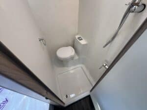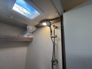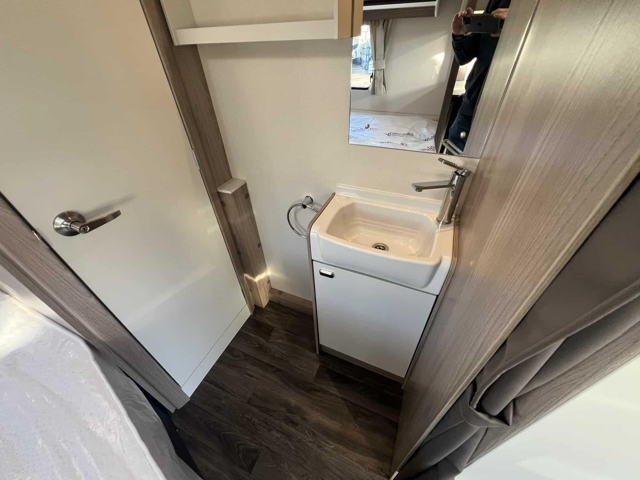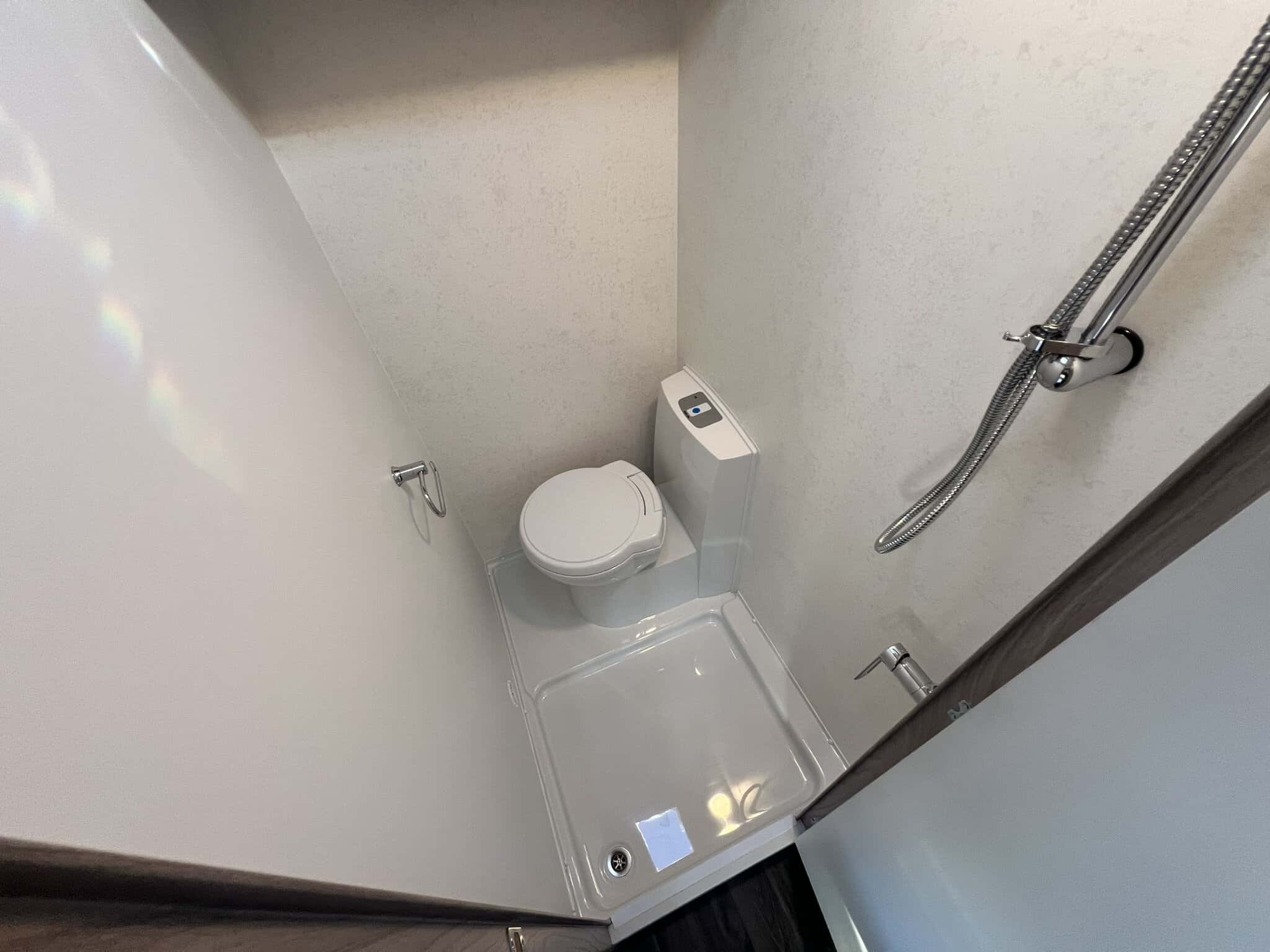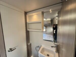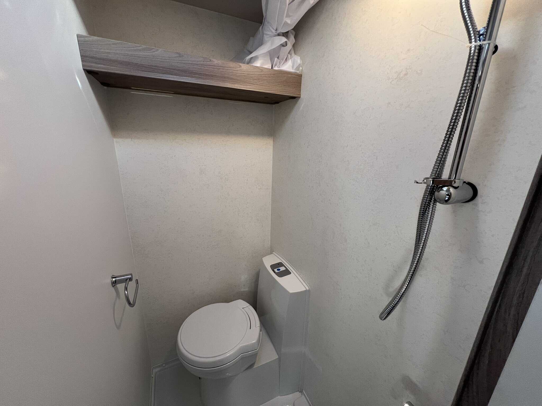 12. Boutique washroom with washbasin, cupboard, mirror, and Ecocamel Jetstorm showerhead for water-saving showers. Plus, NEW White Stipple marble effect shower wallboard and Thetford toilet with electric flush